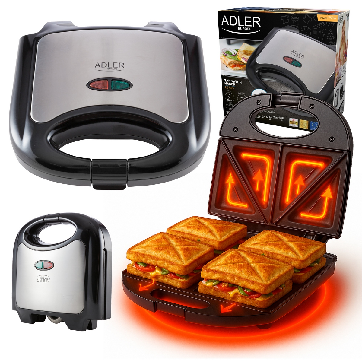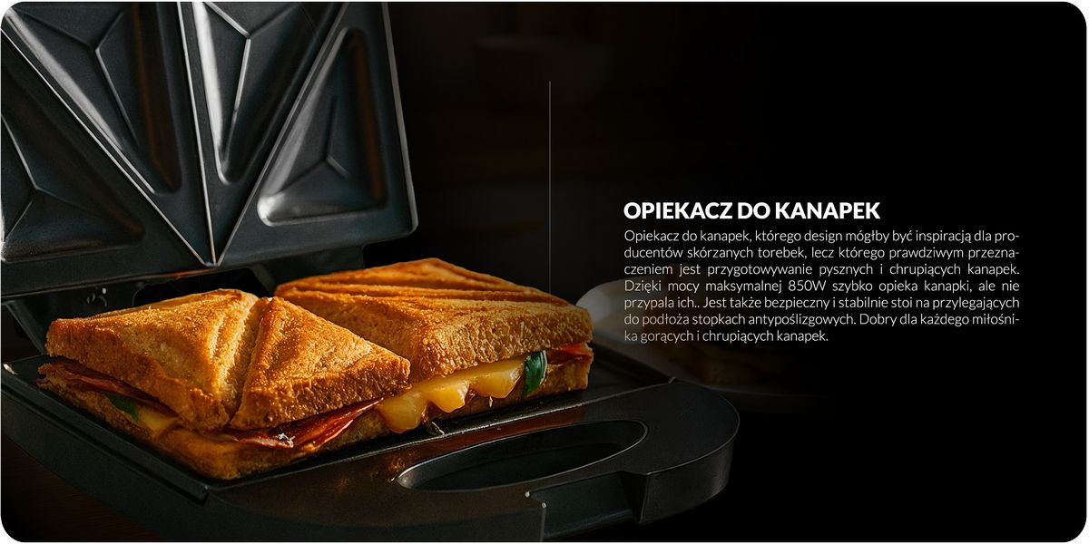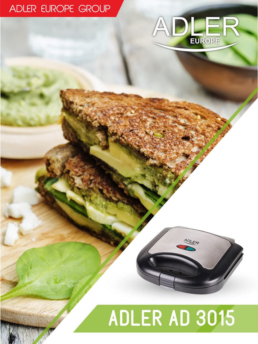 Тостер для бутербродів Adler AD 3015, дизайн якого міг би надихнути виробників шкіряних сумок, але справжнє призначення якого — приготування смачних і хрустких бутербродів. Завдяки максимальній потужності 850 Вт він швидко підсмажує бутерброди, але не підпалює їх. Він також безпечний і стійко стоїть на прилеглих до підлоги нековзних ніжках. Підходить для всіх любителів гарячих і хрустких бутербродів.