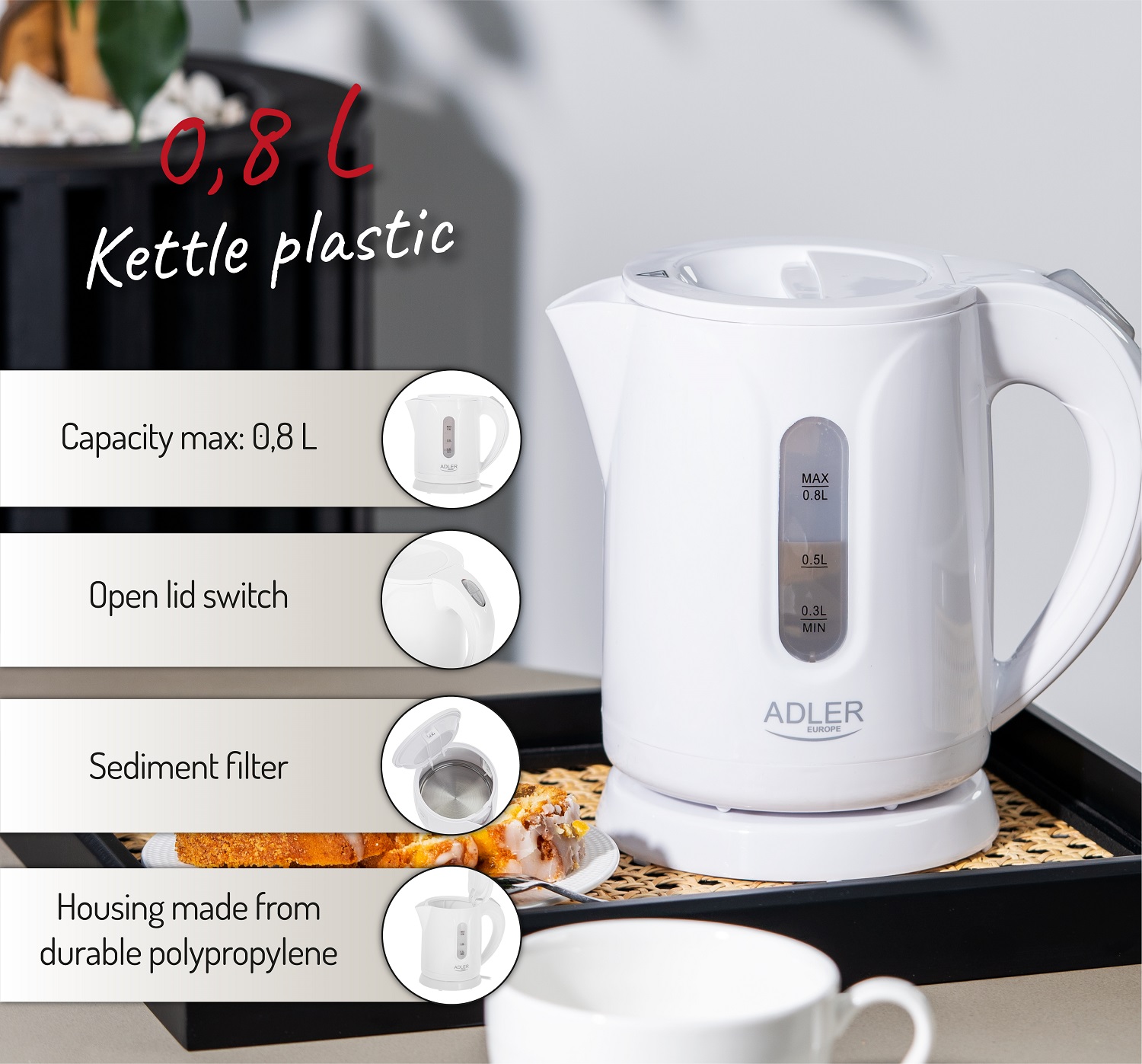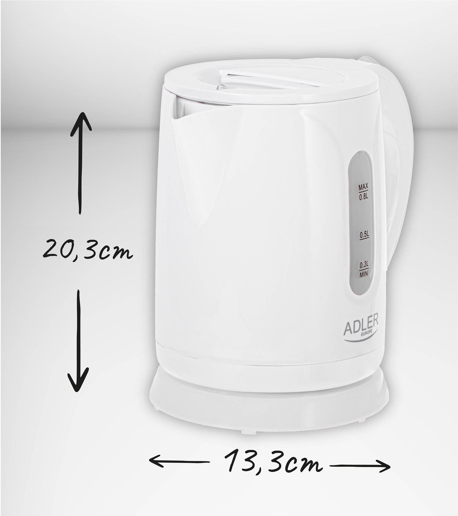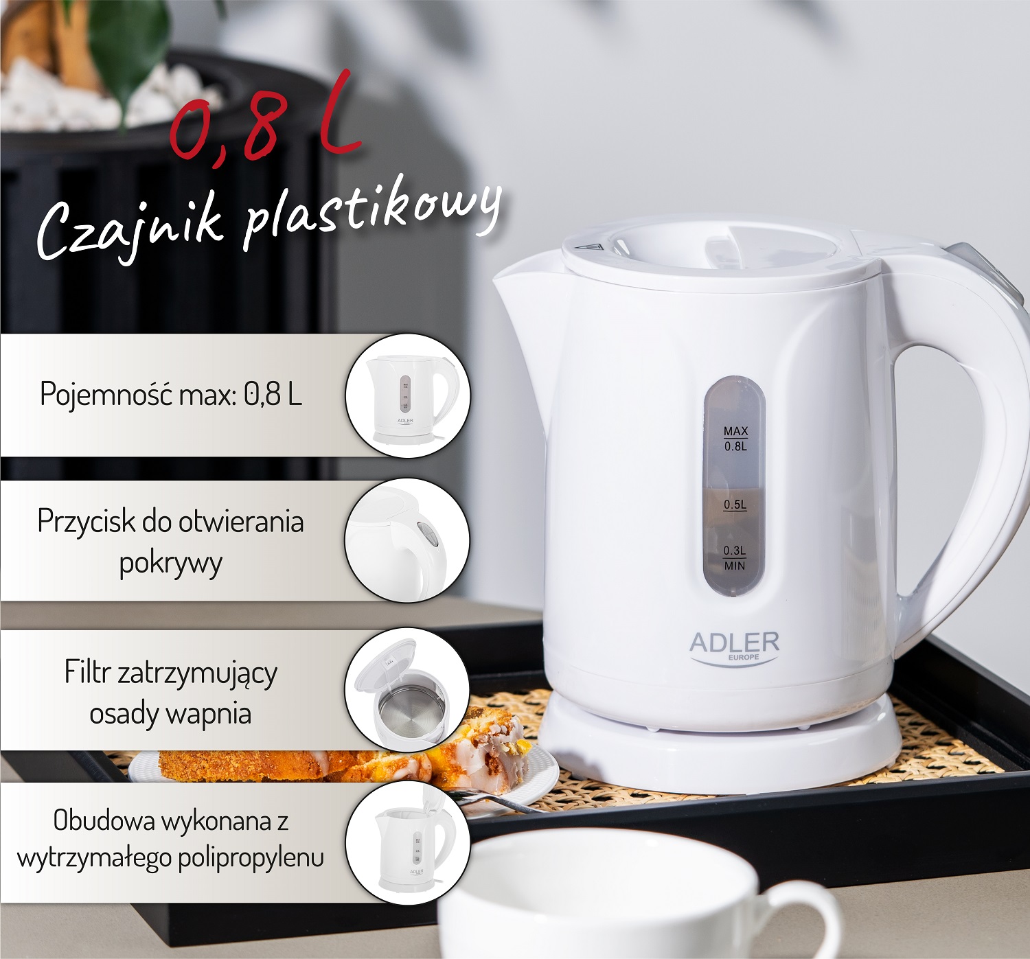 Класичний електричний чайник Adler AD 1371 white об'ємом 0,8 літра, корисний у кожній кухні, офісі та гуртожитку. Його безпеку забезпечує блокування, що унеможливлює увімкнення порожнього чайника, та автоматичне вимкнення після закипання води. Чайник оснащений фільтром, що затримує осад, який покращує смак і якість води. Функціональність підвищують стабільна основа та чіткий індикатор рівня води. Дуже зручний завдяки плоскому дну та обертовій основі. Чайник може похвалитися економічною потужністю 850 Вт.