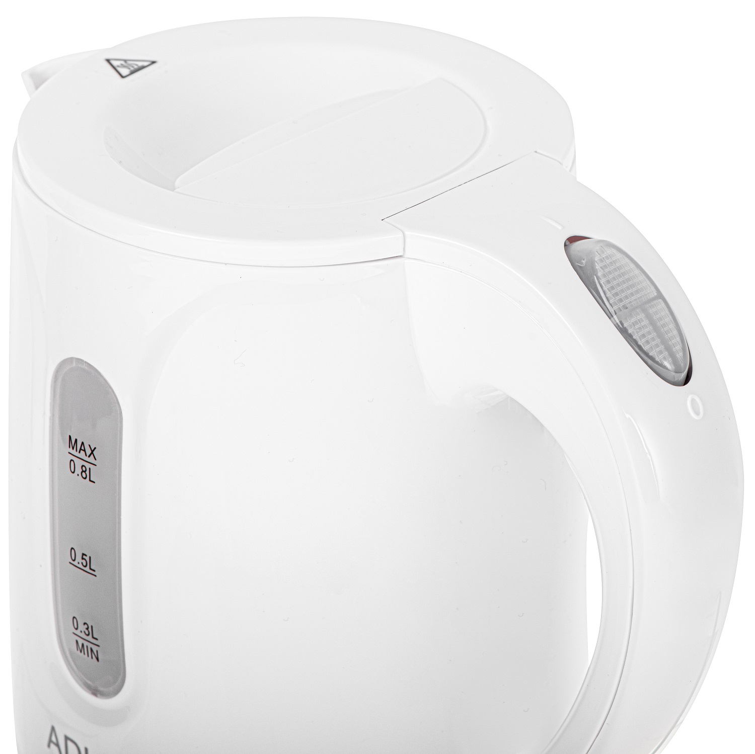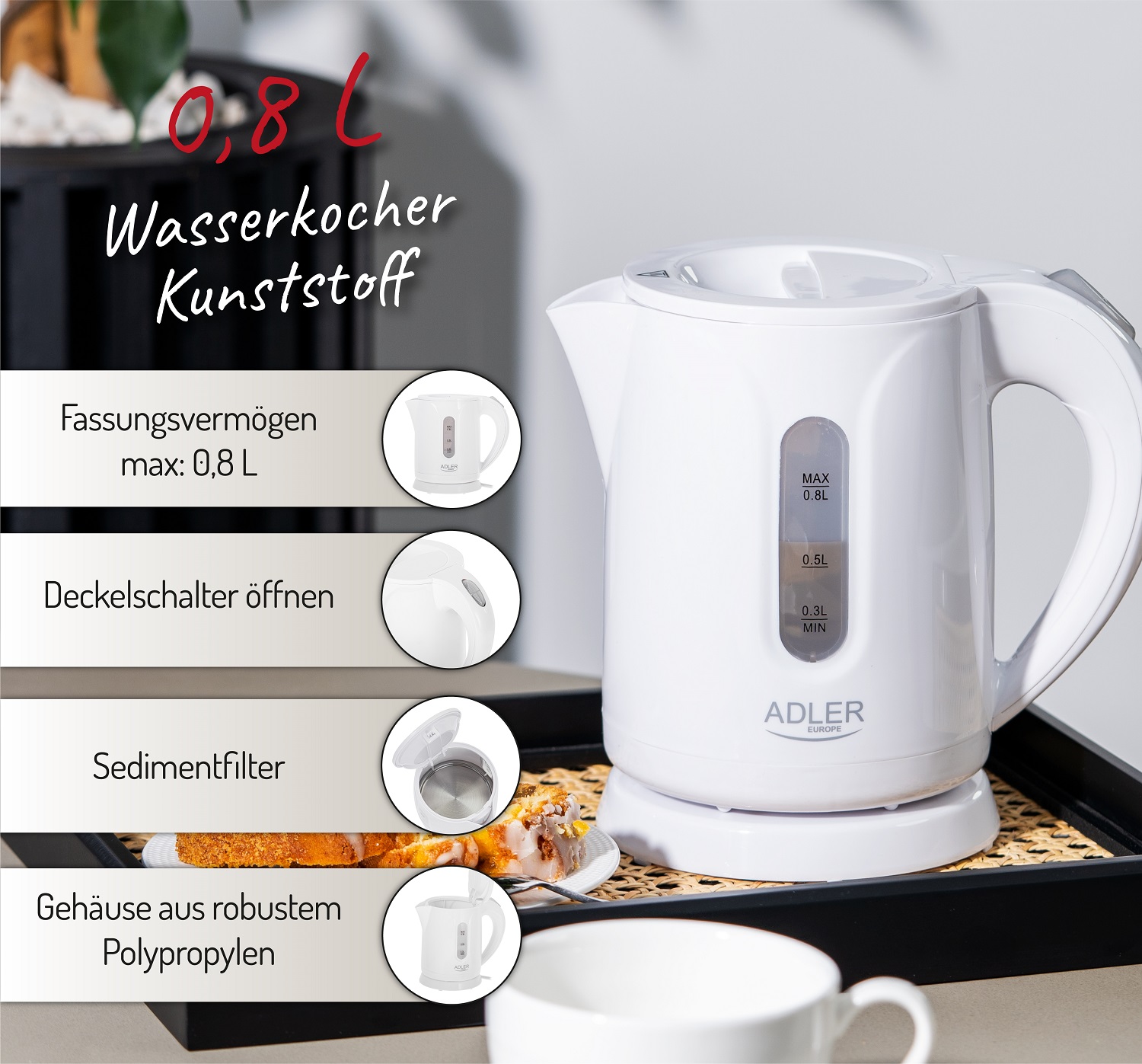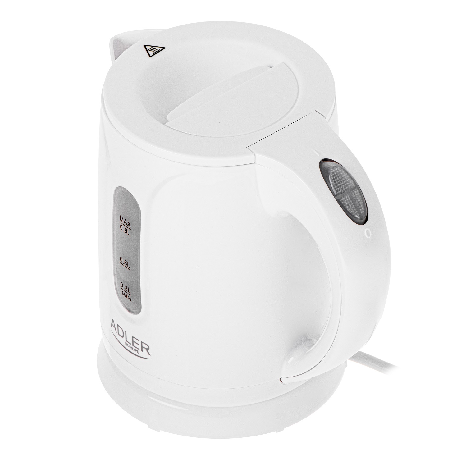 Класичний електричний чайник Adler AD 1371 white об'ємом 0,8 літра, корисний у кожній кухні, офісі та гуртожитку. Його безпеку забезпечує блокування, що унеможливлює увімкнення порожнього чайника, та автоматичне вимкнення після закипання води. Чайник оснащений фільтром, що затримує осад, який покращує смак і якість води. Функціональність підвищують стабільна основа та чіткий індикатор рівня води. Дуже зручний завдяки плоскому дну та обертовій основі. Чайник може похвалитися економічною потужністю 850 Вт.