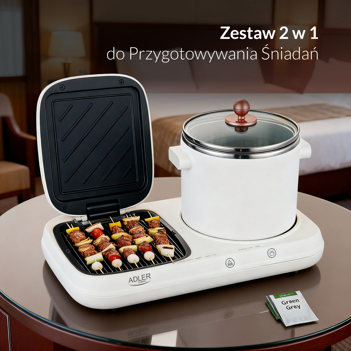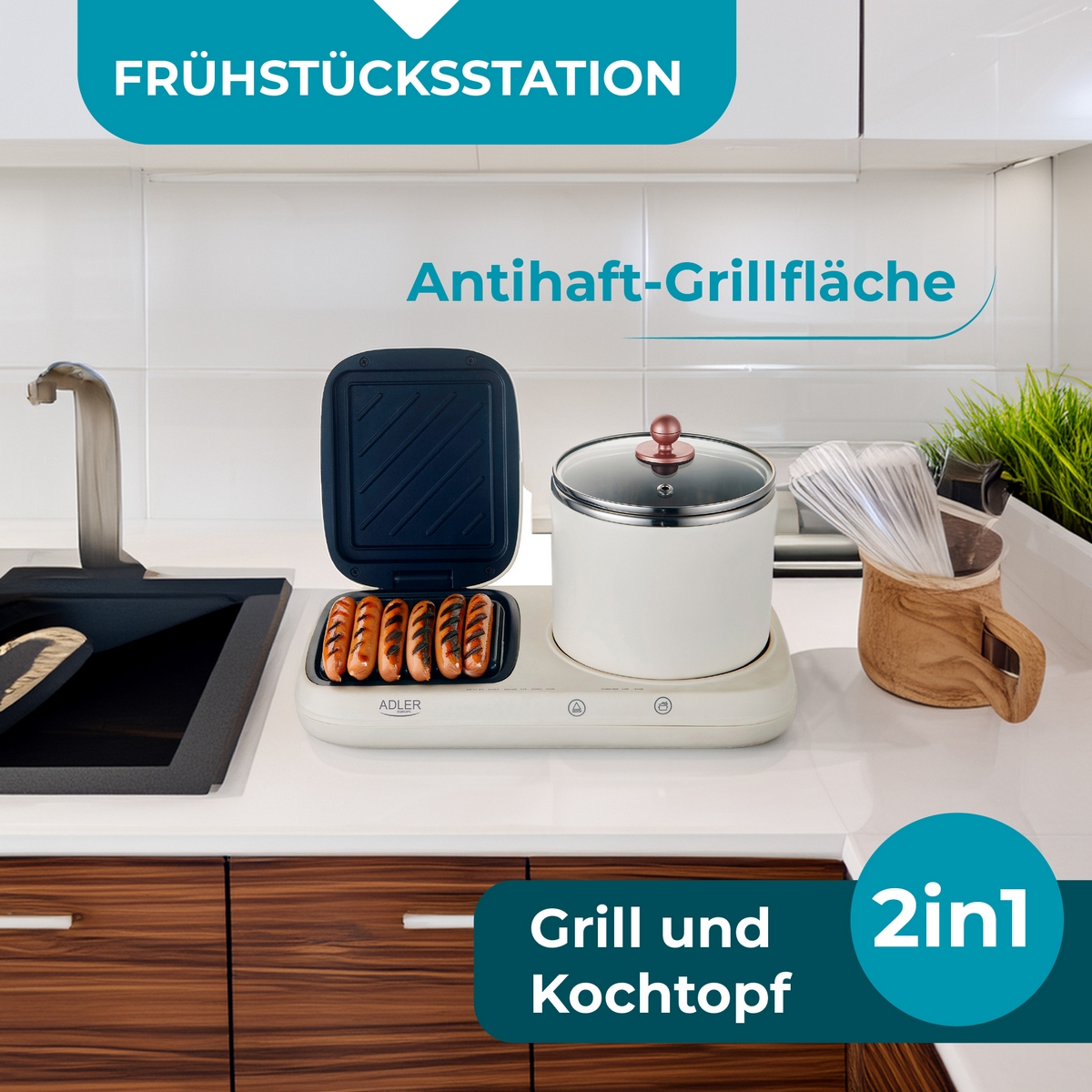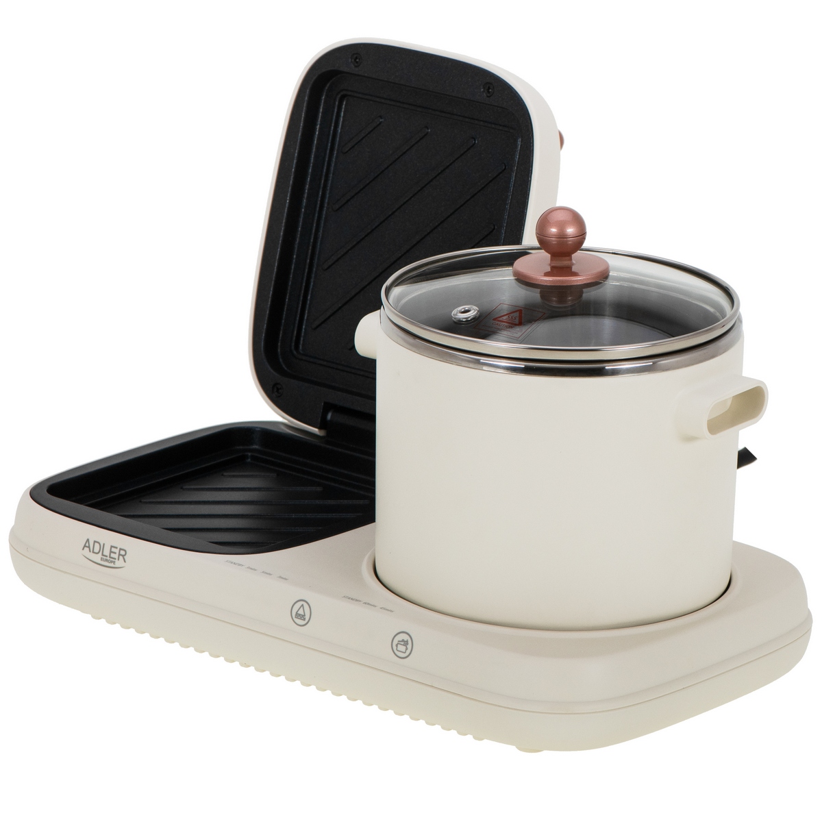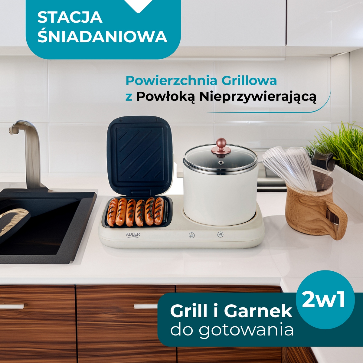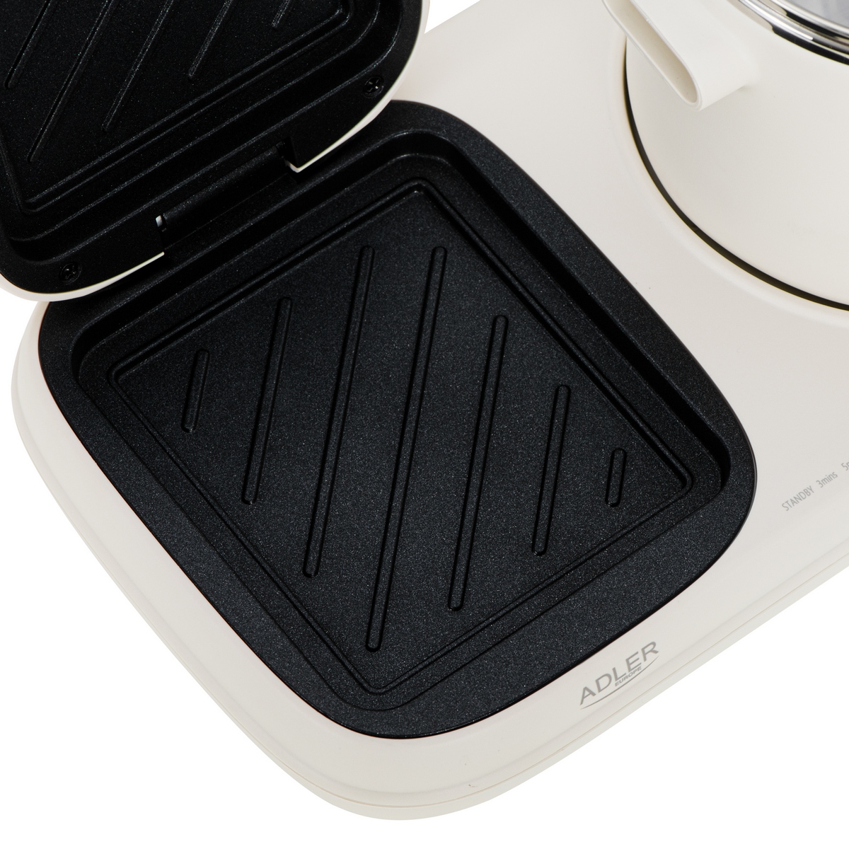 Електричний гриль Adler AD 6421 Сніданок 2 в 1 поєднує функціональність і ретро-шарм у компактному кремовому дизайні, ідеальному для будь-якої кухні. Незалежно від того, чи готуєте ви сніданок, чи шукаєте універсальний прилад для маленької кухні, ця станція для сніданків буде чудовим вибором.