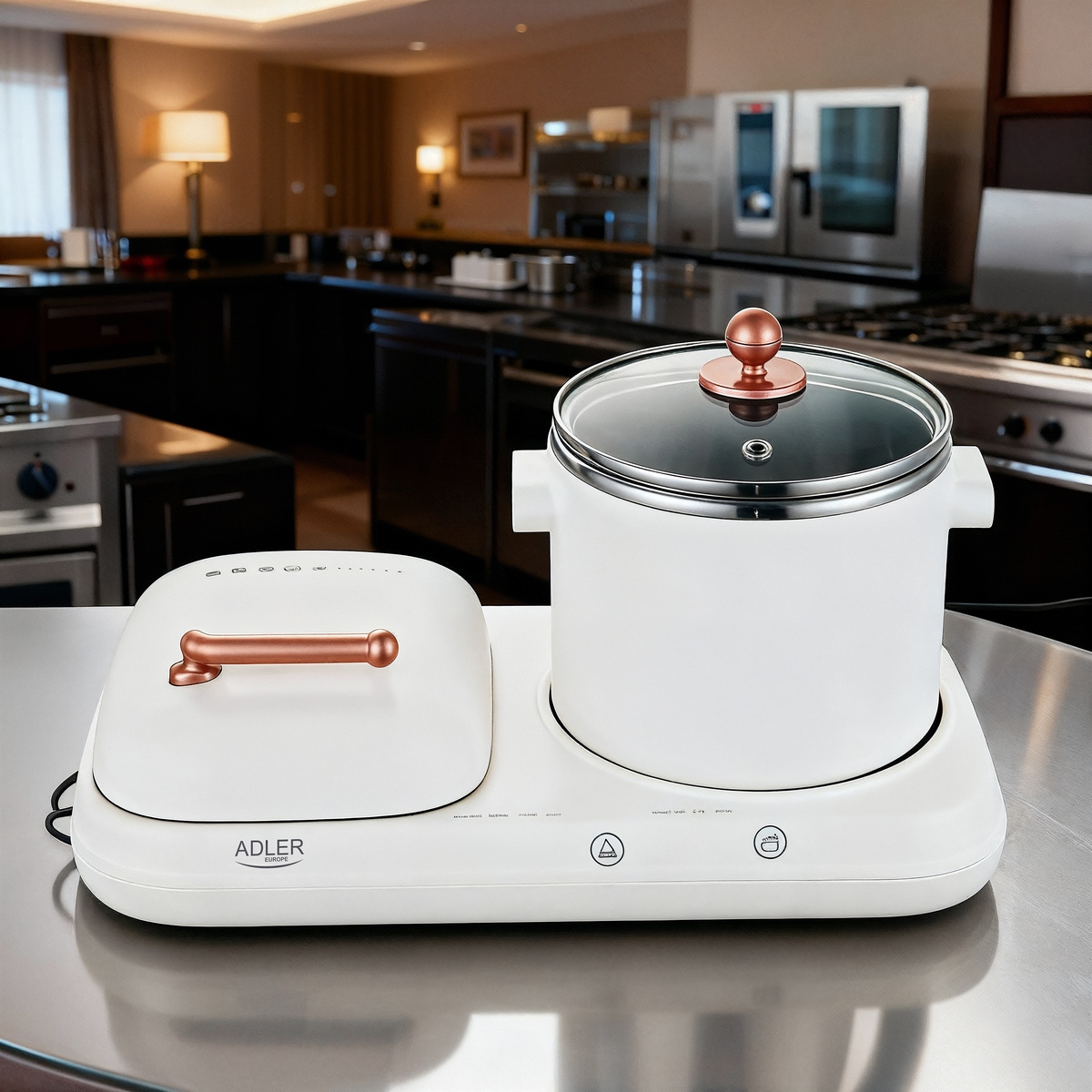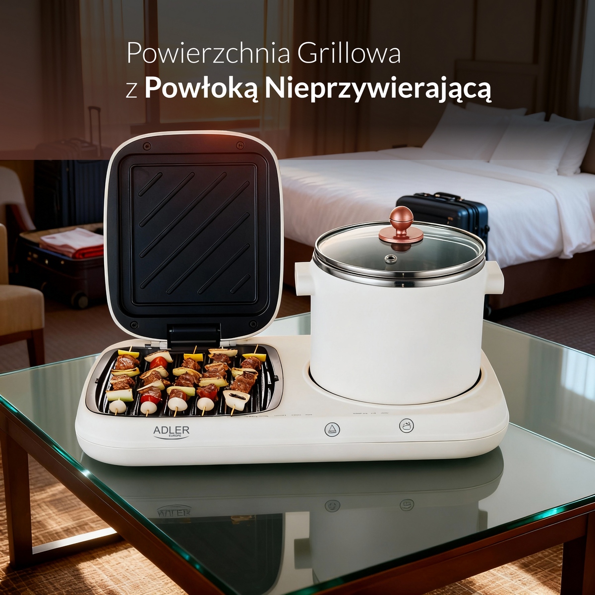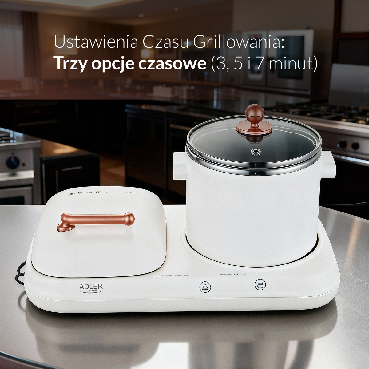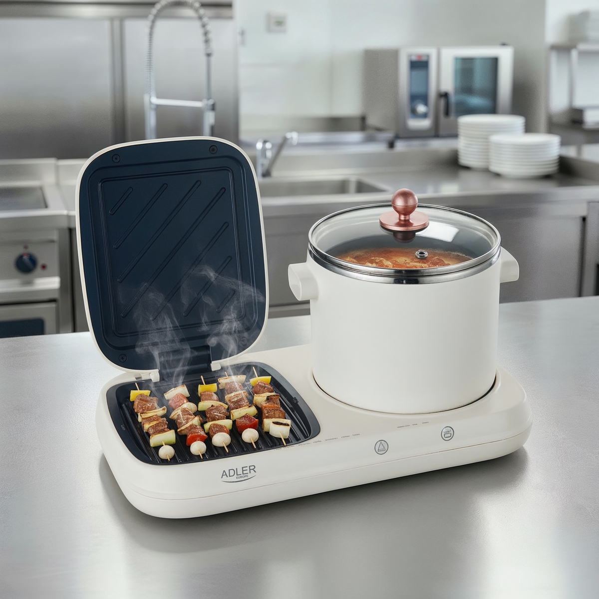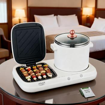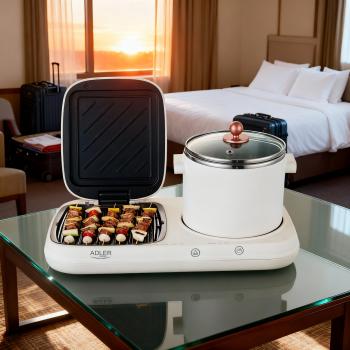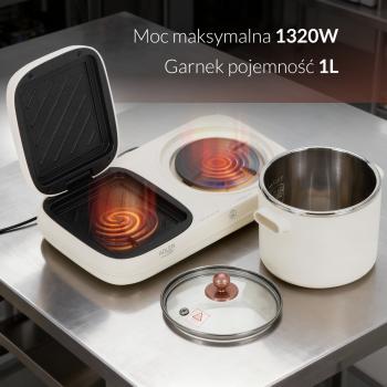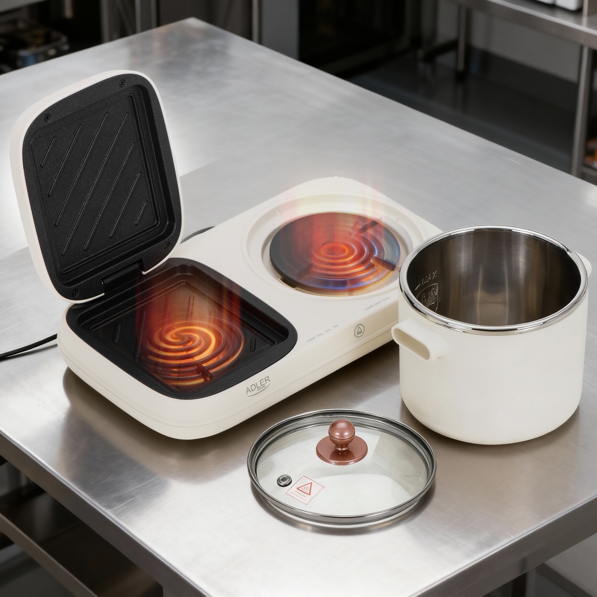 Електричний гриль Adler AD 6421 Сніданок 2 в 1 поєднує функціональність і ретро-шарм у компактному кремовому дизайні, ідеальному для будь-якої кухні. Незалежно від того, чи готуєте ви сніданок, чи шукаєте універсальний прилад для маленької кухні, ця станція для сніданків буде чудовим вибором.
