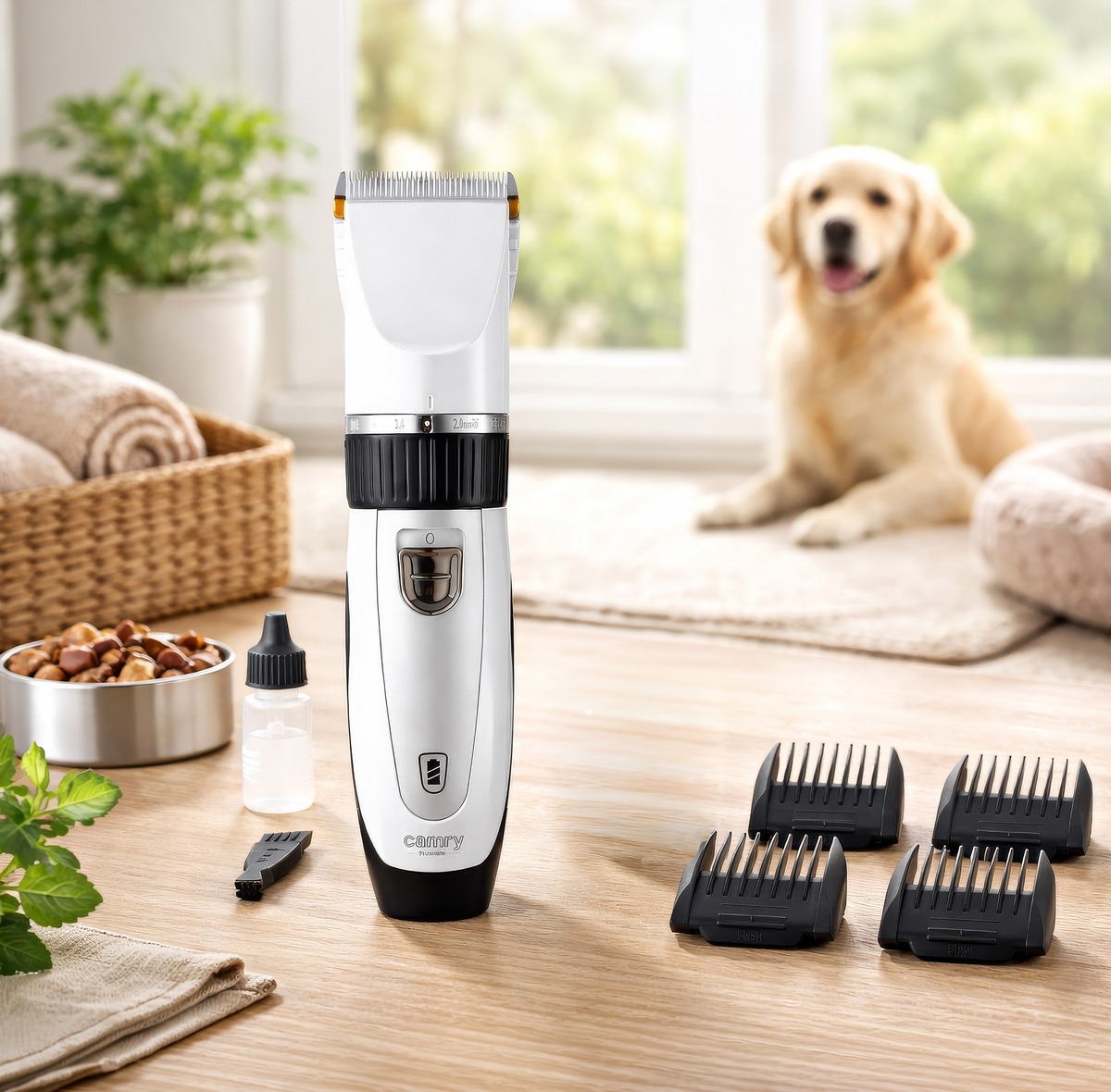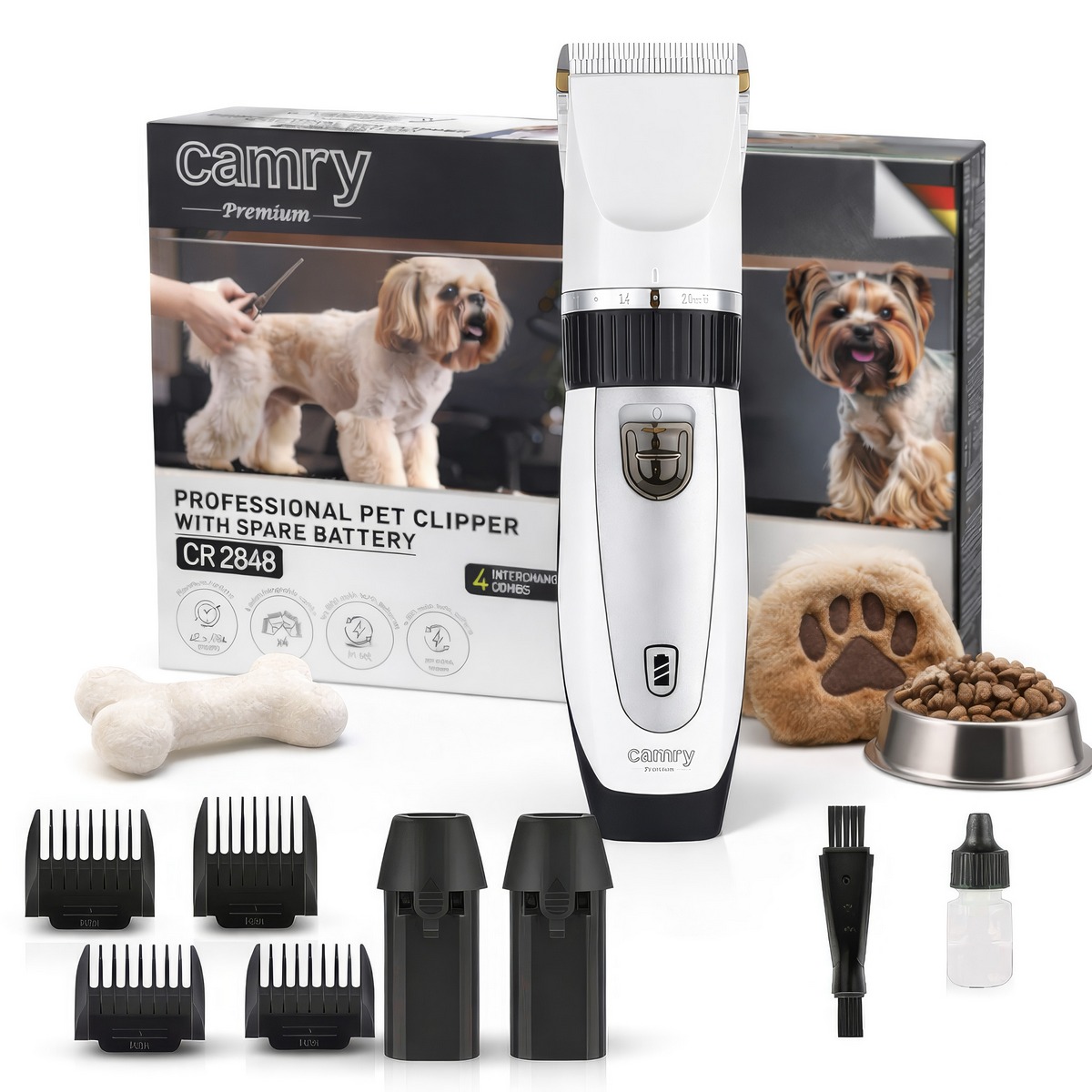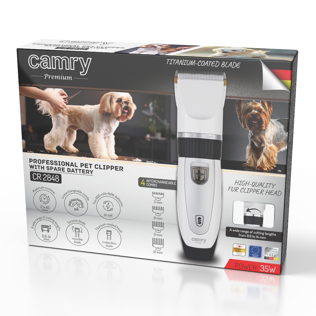 Огляд Професійна машинка для стрижки тварин Camry CR 2848 із запасним акумулятором, титаново-керамічне лезо, 5800 об/хв, регулювання 0,8–14 мм, 4 насадки