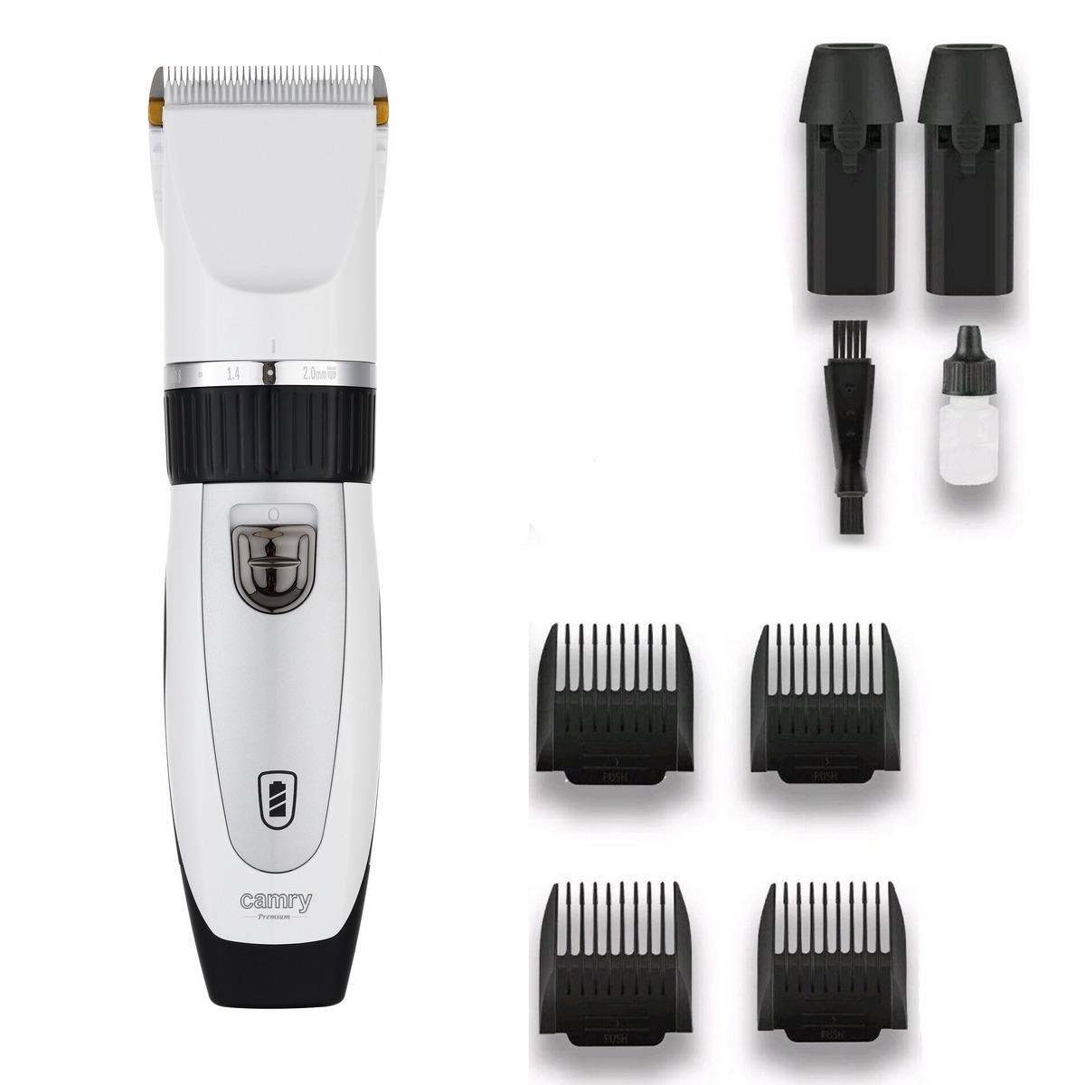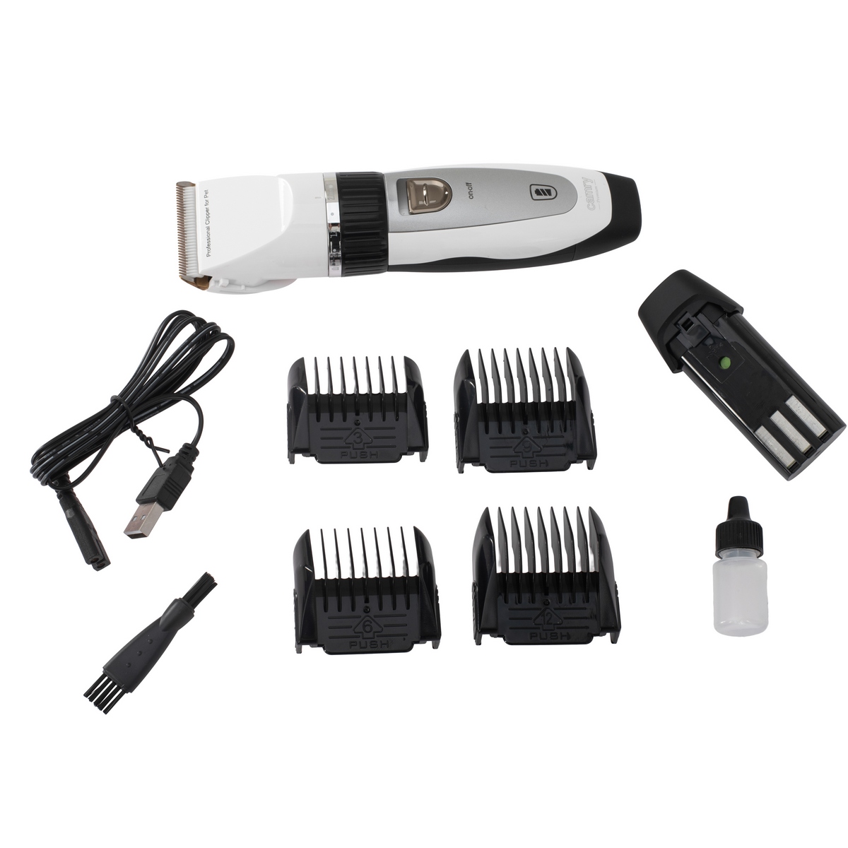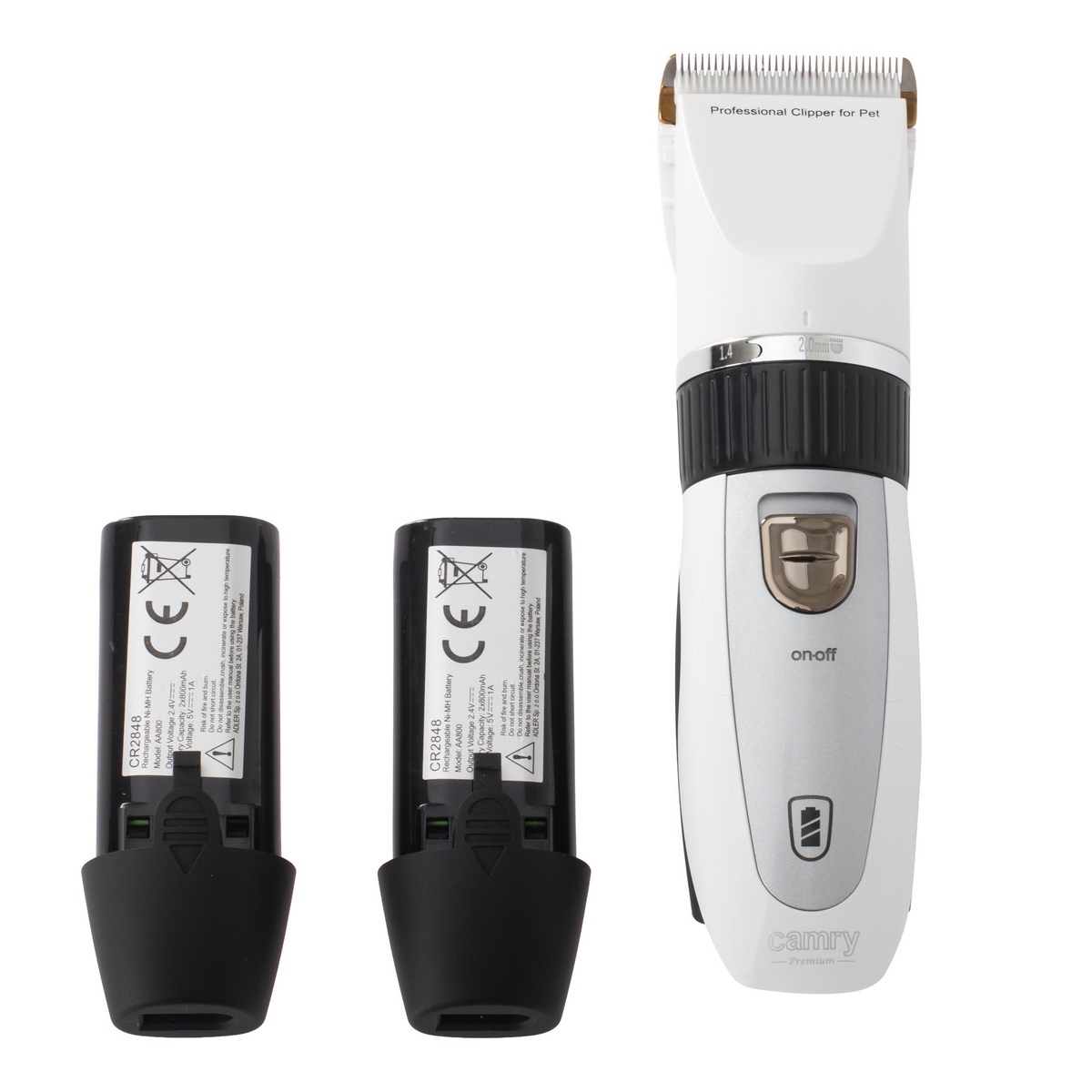 Огляд Професійна машинка для стрижки тварин Camry CR 2848 із запасним акумулятором, титаново-керамічне лезо, 5800 об/хв, регулювання 0,8–14 мм, 4 насадки