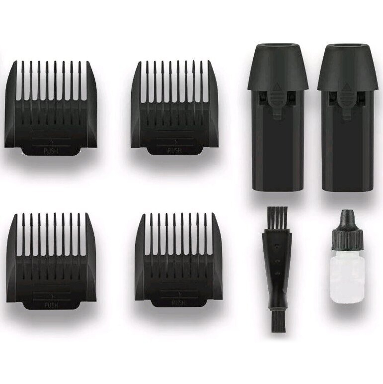 Широкий діапазон регулювання довжини стрижки від 0,8 до 14 мм, що підтримується обертовим кільцем та чотирма змінними гребінцями, дає повний контроль над кінцевим результатом. Запасна батарея та функція аварійного заряджання усувають ризик переривання роботи, а прогумований корпус підвищує комфорт використання.