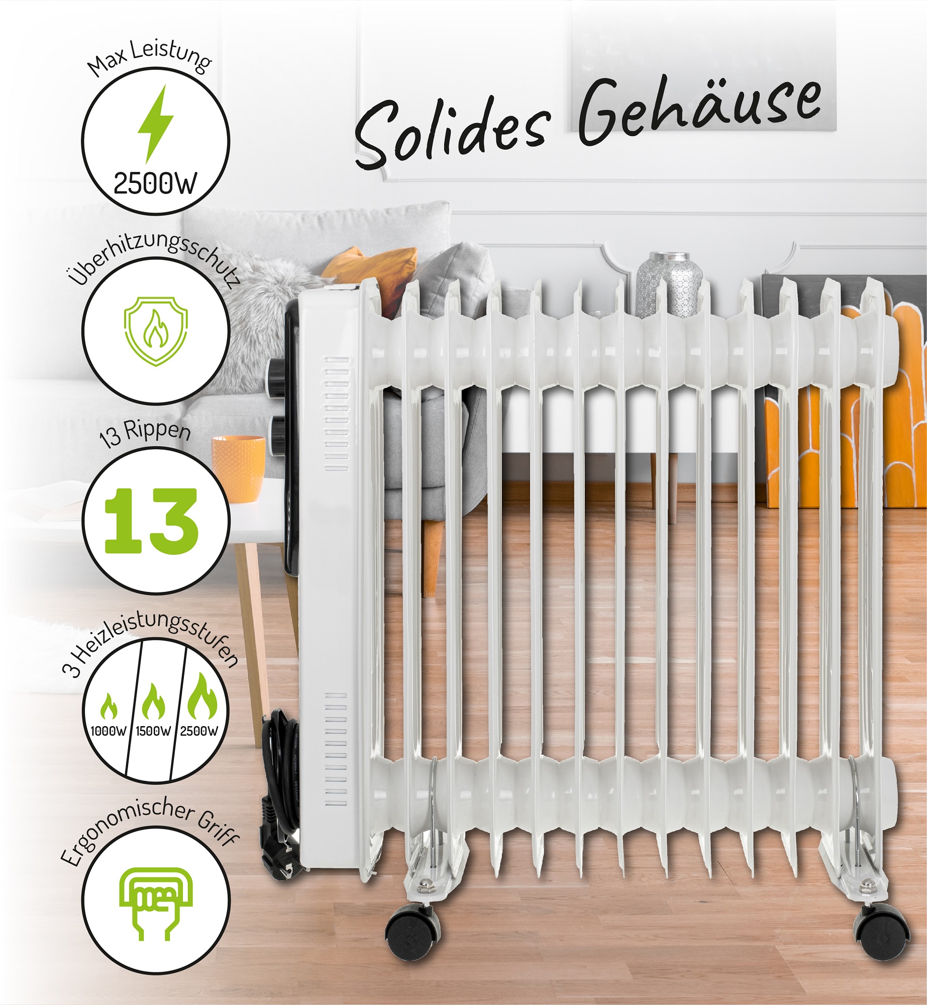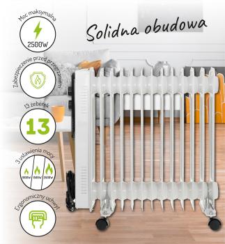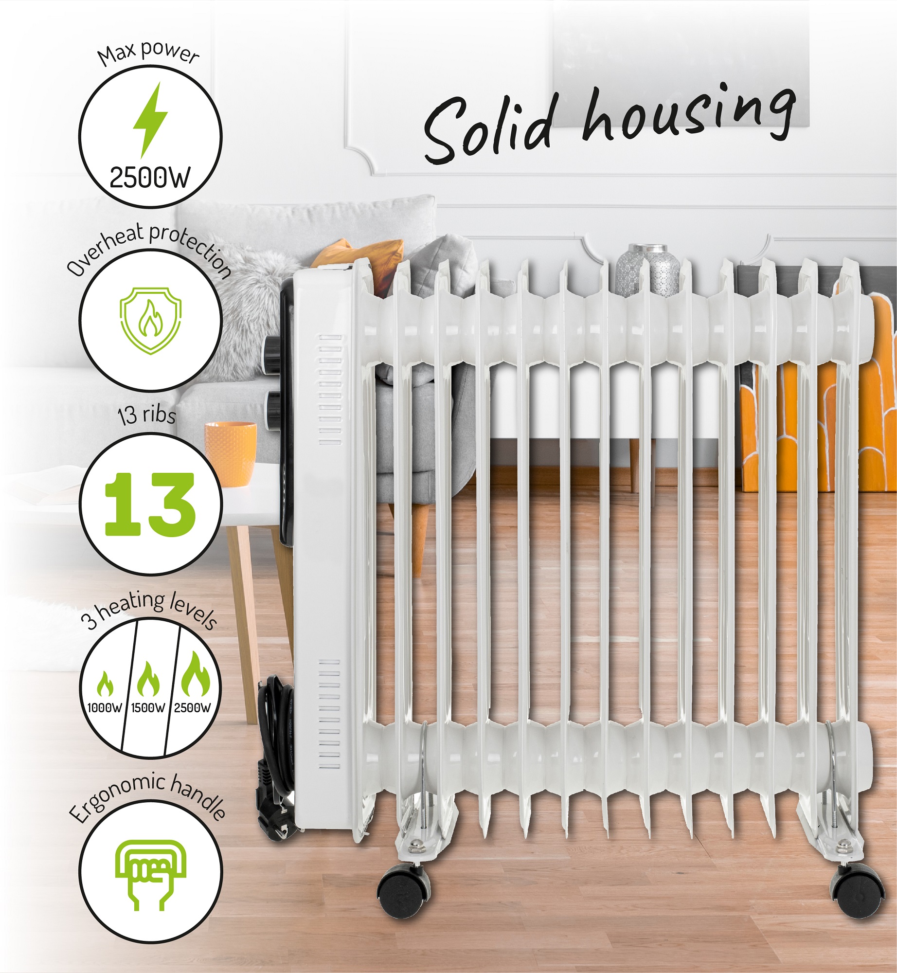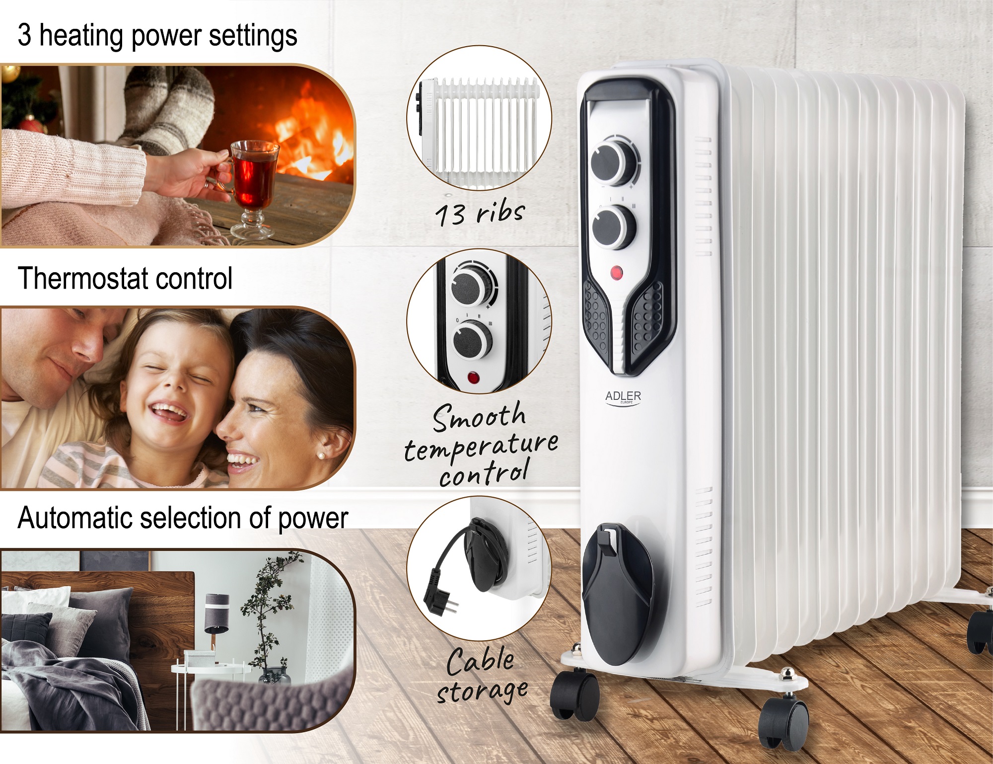 Ефективний масляний обігрівач Adler AD 7818. Дозволяє обігріти приміщення, в якому немає радіаторів або вони недостатньо ефективні. Незамінний під час аварії системи опалення. Обігрівач дає можливість плавного регулювання температури, працює на 3 рівнях потужності. Обігрівач автоматично підбирає споживання енергії до встановленої температури нагрівання. Для безпеки використання пристрій оснащений захистом від перегріву. Обігрівач виконаний в елегантній лінії, завдяки чому його можна встановити в місці прийому гостей у будинку або клієнтів в офісі. Має 13 ребер нагріву і потужність 2500 Вт.