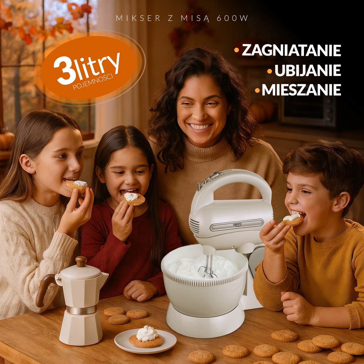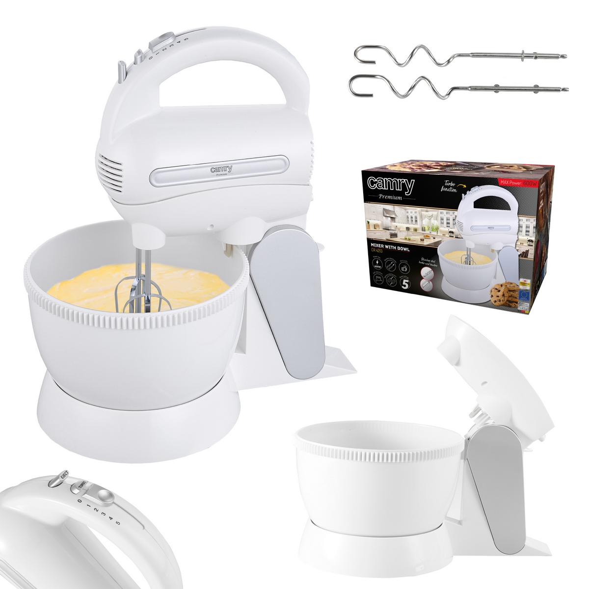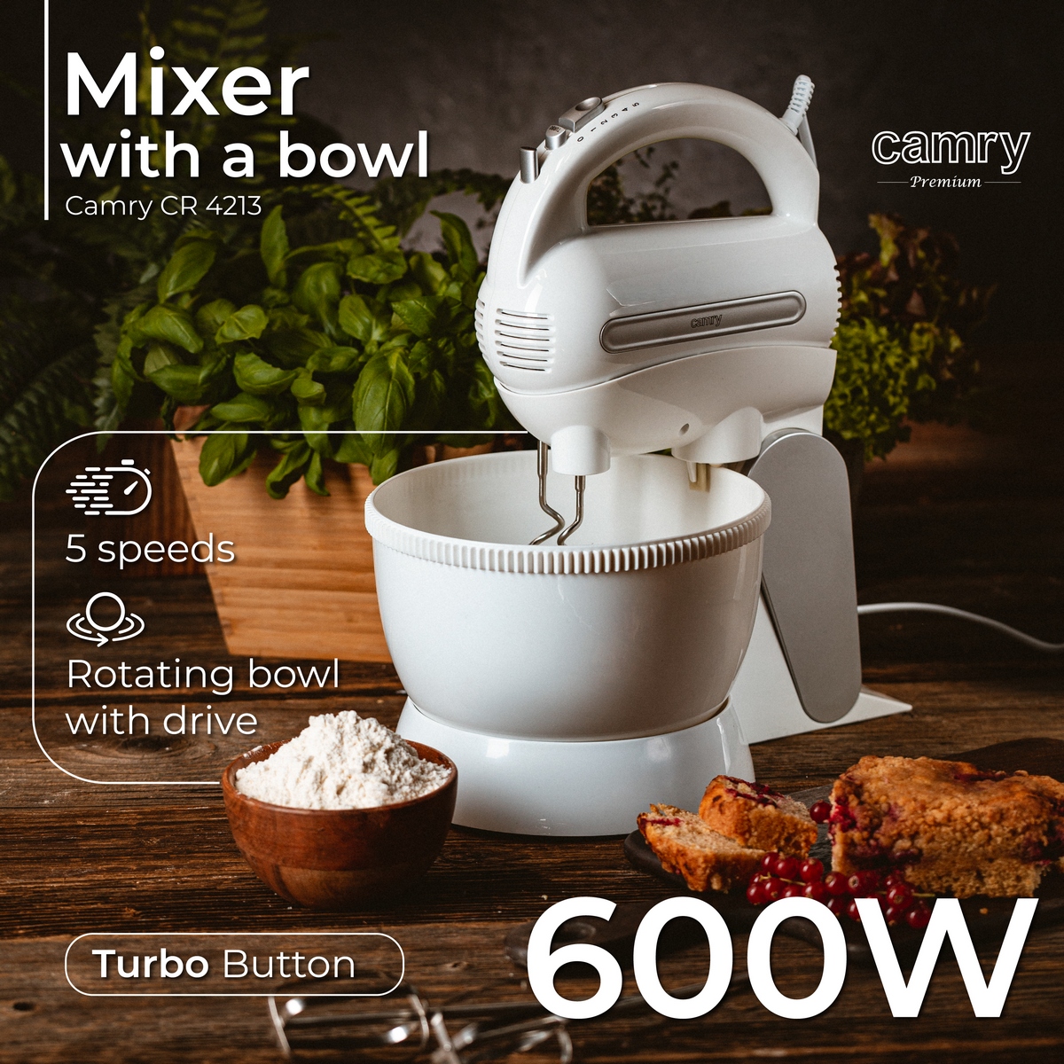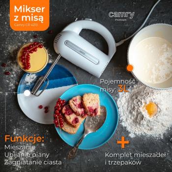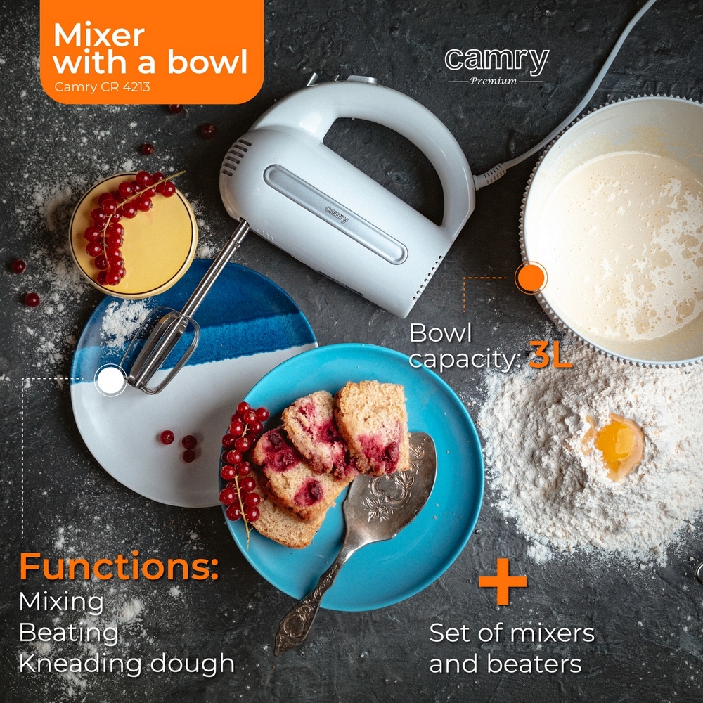 Ви проводите довгі години на кухні, готуючи смаколики для всієї родини? Ви вважаєте, що на зустрічі з друзями слід готувати тільки домашню їжу? А може, ви шукаєте зручний прилад, який дозволить вам заощадити час у вихідні дні під час приготування ласощів для найменших? Міксер з чашею CAMRY CR 4213 — це продукт, який повинен бути в кожному домі! Він полегшує приготування тортів і печива, а також напівфабрикатів для інших страв!