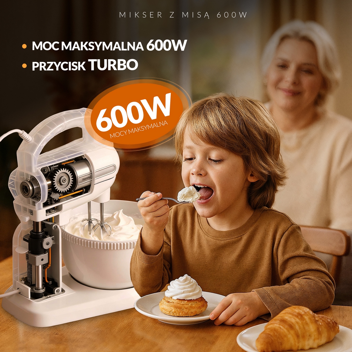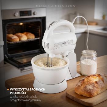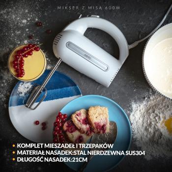 Зручний кухонний міксер потужністю 600 Вт. Незамінний для всіх, хто пече тісто та печиво. Дозволяє використовувати 5 різних швидкостей, залежно від типу готуваної страви. Завдяки цьому він підходить як для змішування борошна з іншими інгредієнтами, так і для збивання яєць, кремів, збитих вершків. При необхідності можна також використовувати функцію Turbo. Робот практичний і міцний, завдяки чому його можна використовувати протягом тривалого часу без ризику виходу з ладу. Обертова чаша з приводом не вимагає від користувача тримати робот в руках, що робить його більш зручним, ніж стандартні моделі.