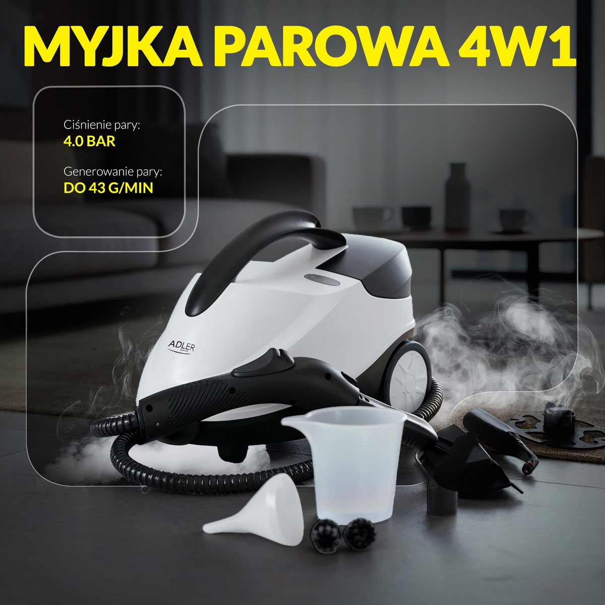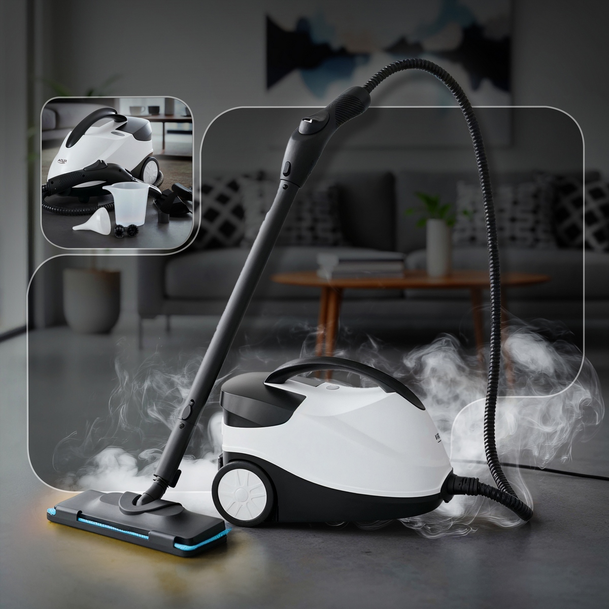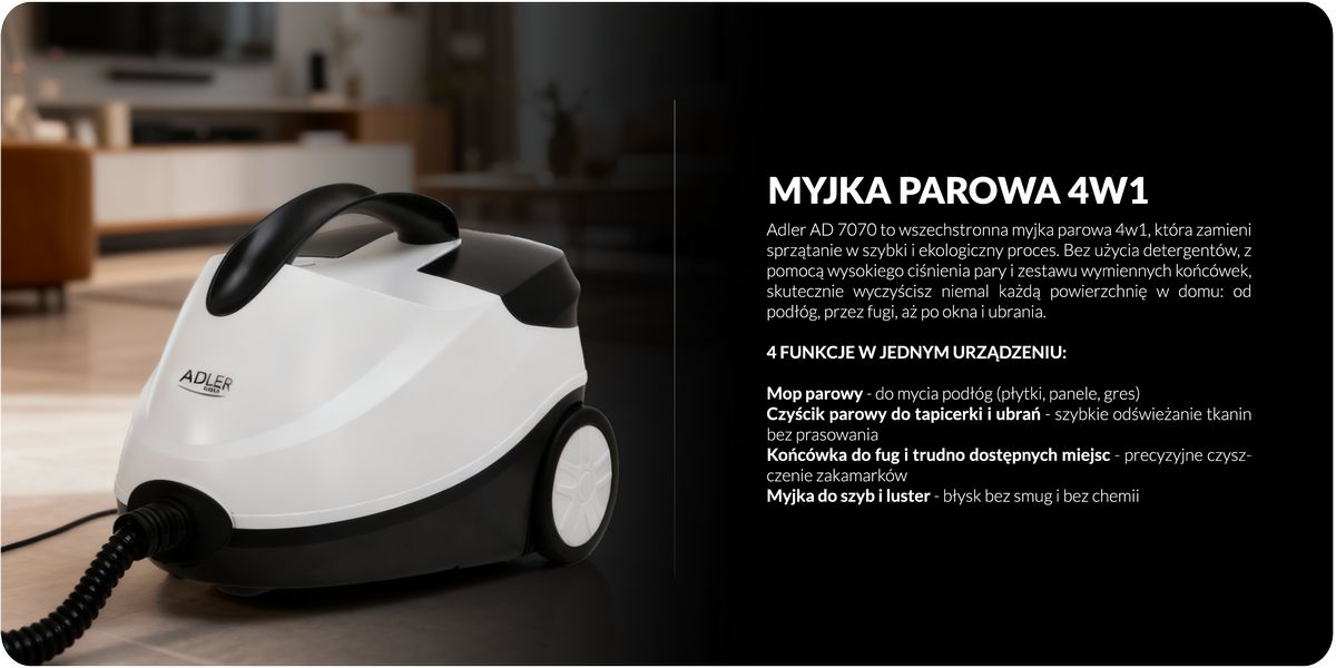 Парова сисиема Adler AD 7070 — це універсальний паровий очищувач 4 в 1, який перетворить прибирання на швидкий та екологічний процес. Без використання миючих засобів, за допомогою високого тиску пари та набору змінних насадок, ви ефективно очистите майже будь-яку поверхню в будинку: від підлоги, швів, до вікон та одягу.