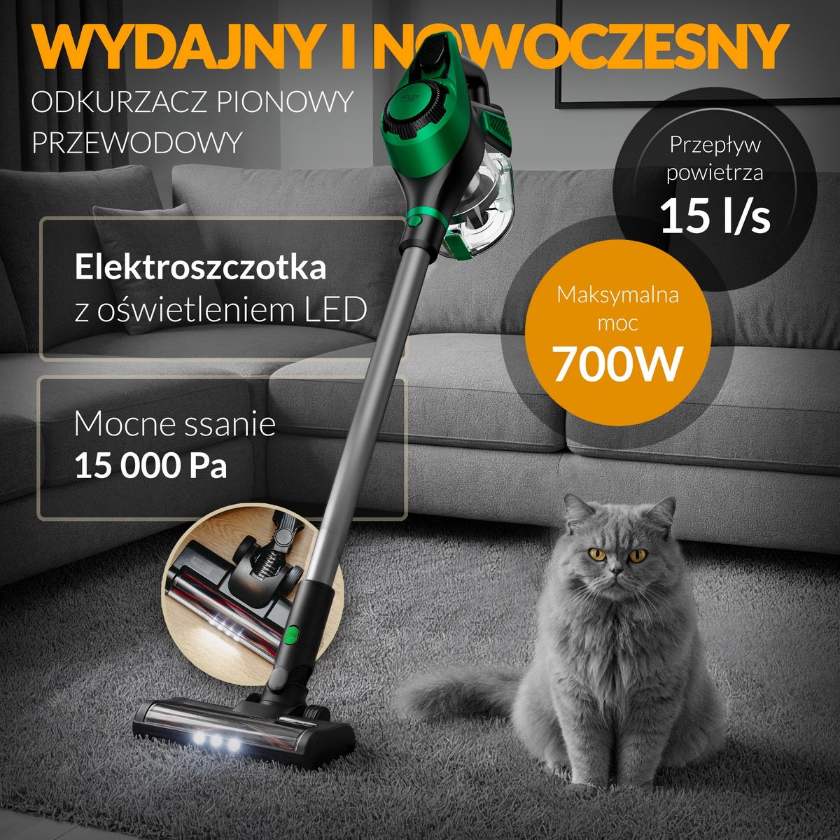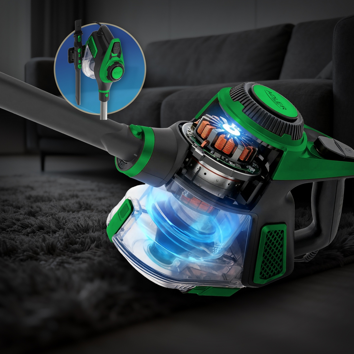 Огляд Пилосос 2в1 вертикальний + ручний Adler AD 7083 green з електрощіткою LED | Сила всмоктування 15 000 Па | Фільтр HEPA 13