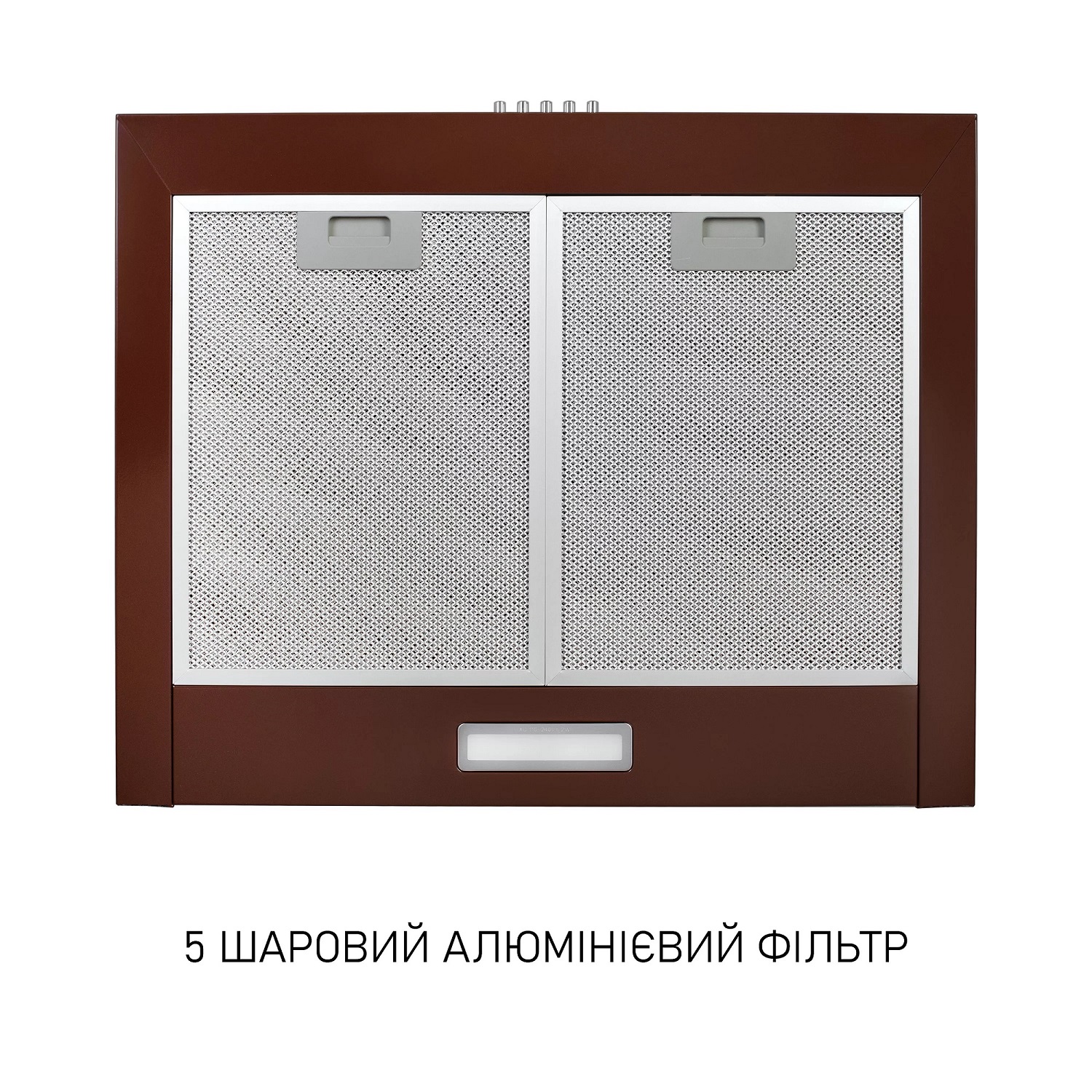 - Алюмiнiєві фiльтри ефективно затримують жир i забруднення, що утворюються пiд час приготування. Їх можна мити багаторазово, що робить витяжку економною в обслуговуваннi.