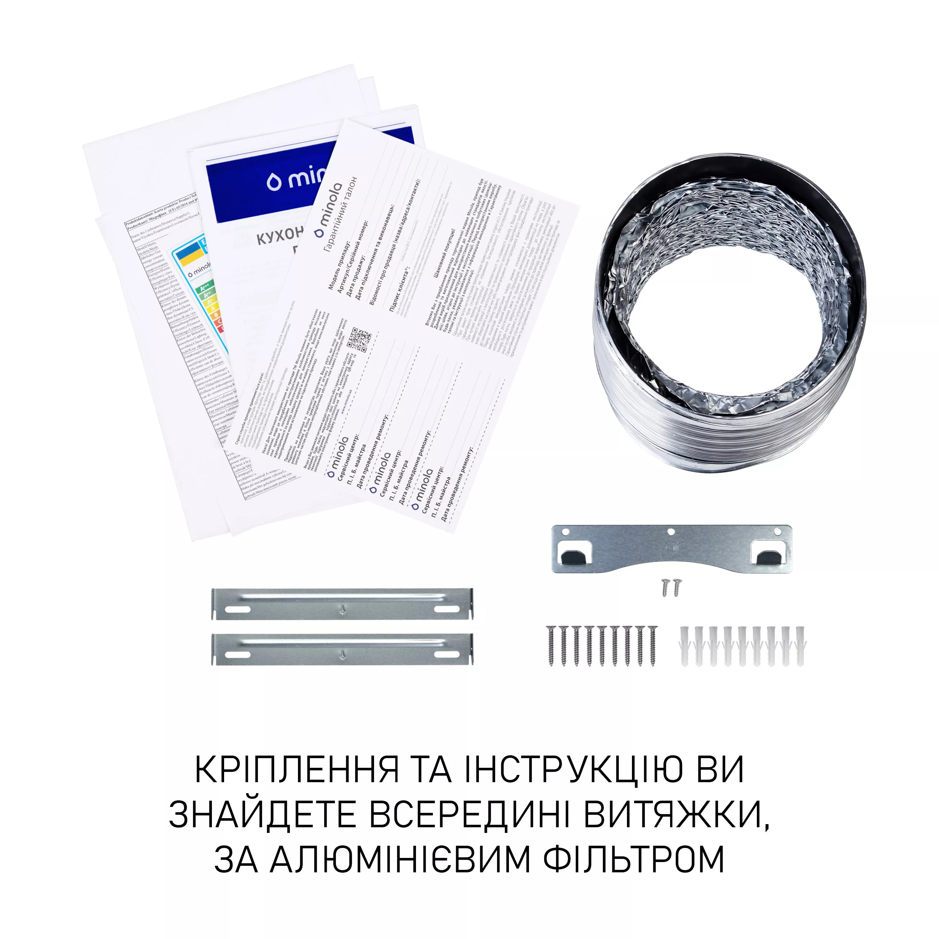 Корпус витяжки виконано з металу з термостійким покриттям у кольорі бронзи. Скляний козирок забезпечує додатковий захист від жиру та сприяє кращому розподілу світла. Кнопки керування виготовлені з міцного пластику та добре витримують навантаження. Загальний дизайн гармонійно доповнює класичні кухні й додає їм стильного вигляду.