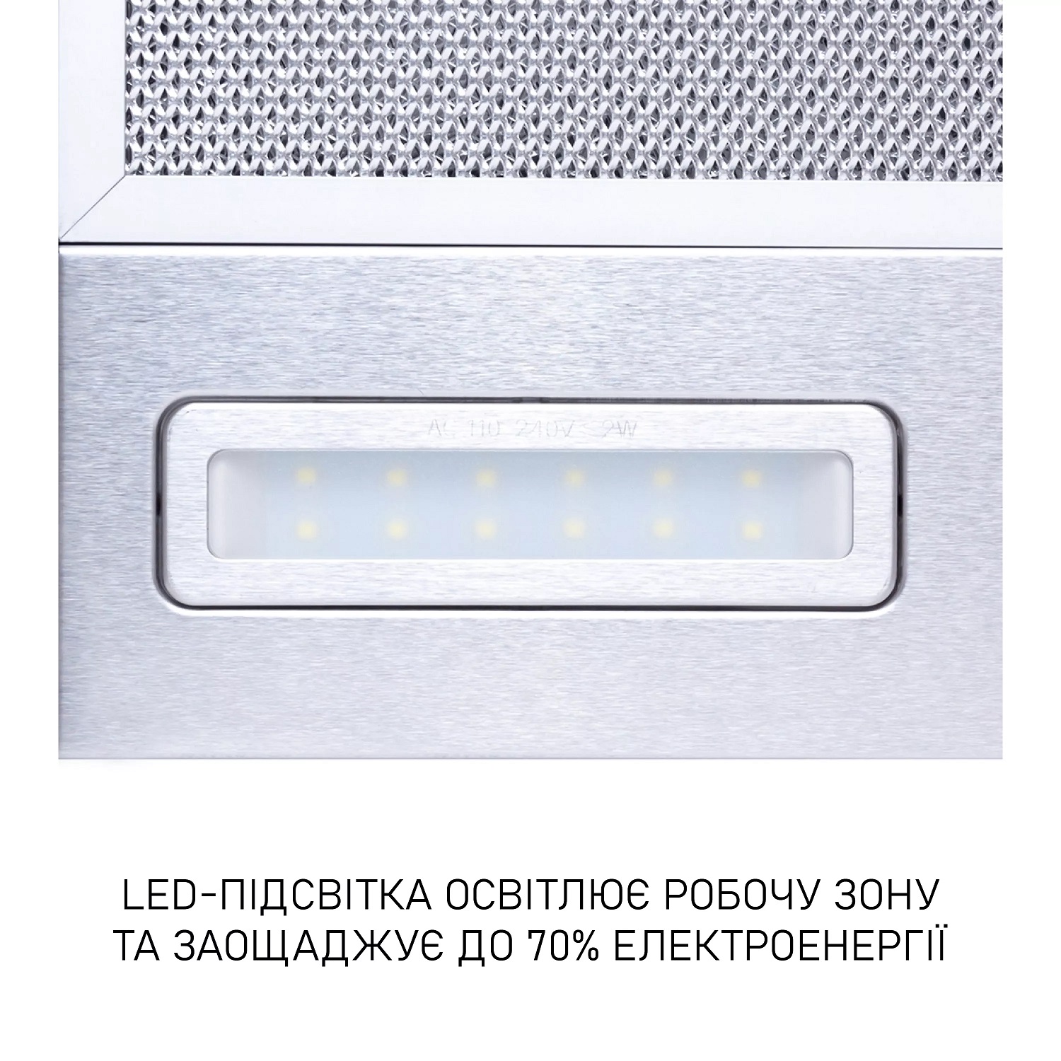 Кухонна витяжка обладнана двома LED-лампами загальною потужністю 4 Вт. Світлодіоди забезпечують комфортне додаткове освітлення варильної поверхні і є найбільш економним джерелом світла.