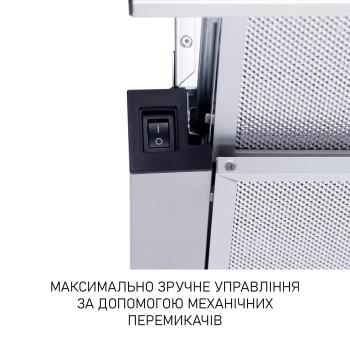 Механічна панель управління дуже проста та інтуїтивно зрозуміла. На ній розташовані перемикачі для увімкнення/вимкнення витяжки, освітлення та перемикання швидкостей. Активувати потрібну функцію можна одним натиском. Механічні перемикачі управління найбільш надійні та довговічні.