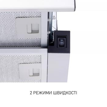 Витяжка має 2 швидкості роботи. Необхідна швидкість обирається виходячи з інтенсивності забруднення повітря кухні. Кожній швидкості характерна різна продуктивність: