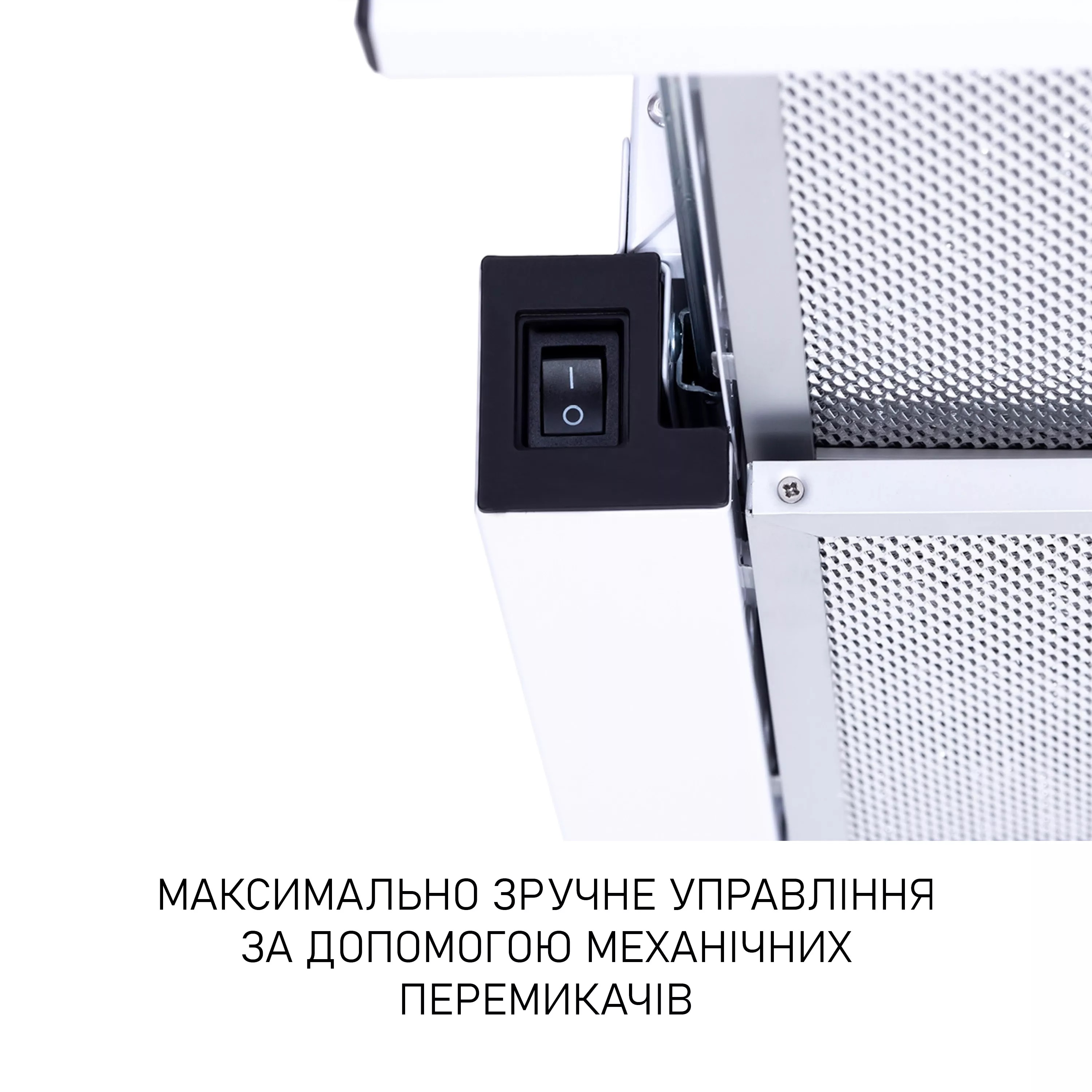 Механічна панель управління дуже проста та інтуїтивно зрозуміла. На ній розташовані перемикачі для увімкнення/вимкнення витяжки, освітлення та перемикання швидкостей. Активувати потрібну функцію можна одним натиском. Механічні перемикачі управління найбільш надійні та довговічні.