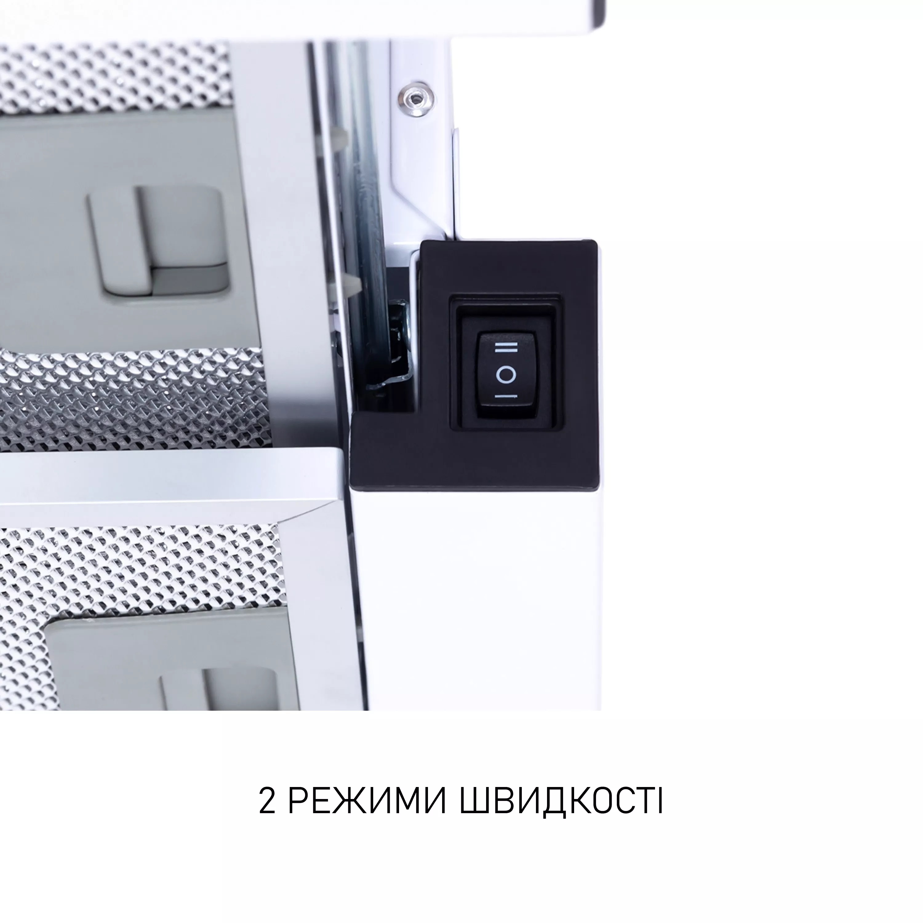 Витяжка має 2 швидкості роботи. Необхідна швидкість обирається виходячи з інтенсивності забруднення повітря кухні. Кожній швидкості характерна різна продуктивність: