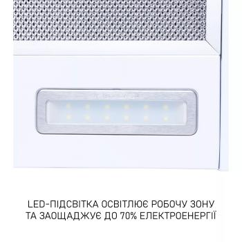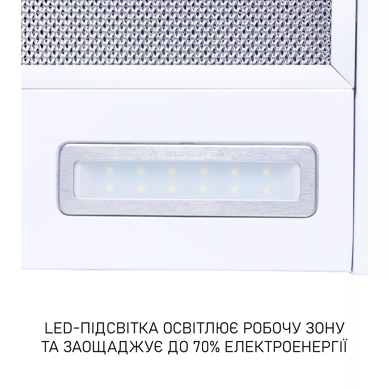 Кухонна витяжка обладнана двома LED-лампами загальною потужністю 4 Вт. Світлодіоди забезпечують комфортне додаткове освітлення варильної поверхні і є найбільш економним джерелом світла.