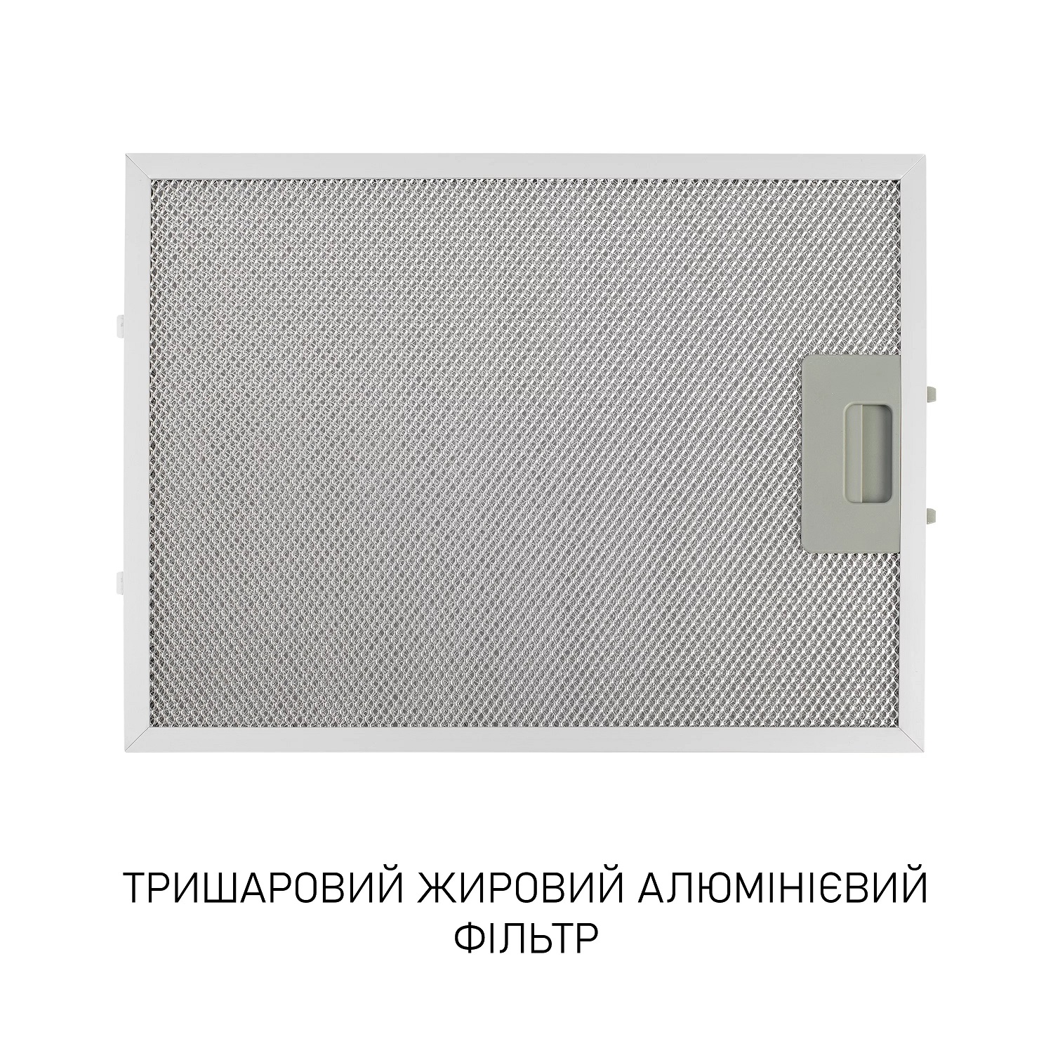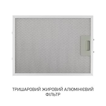 Витяжка обладнана тришаровим алюмінієвим фільтром, який ефективно захищає двигун та внутрішні компоненти пристрою від забруднення жиром і випарами.