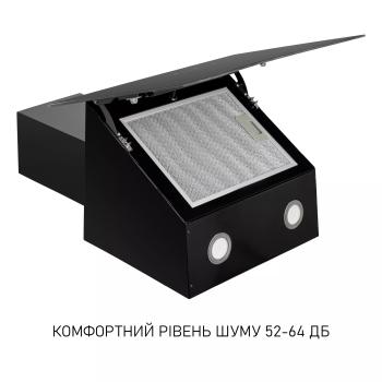 Рівень шуму витяжки 52-64 дБ та є комфортним для людини та домашніх тварин. Витяжка для кухні може працювати в режимі відведення повітря, при якому забруднене повітря виводиться назовні через гнучкий трубопровід, або в режимі рециркуляції* з використанням вугільного фільтра.