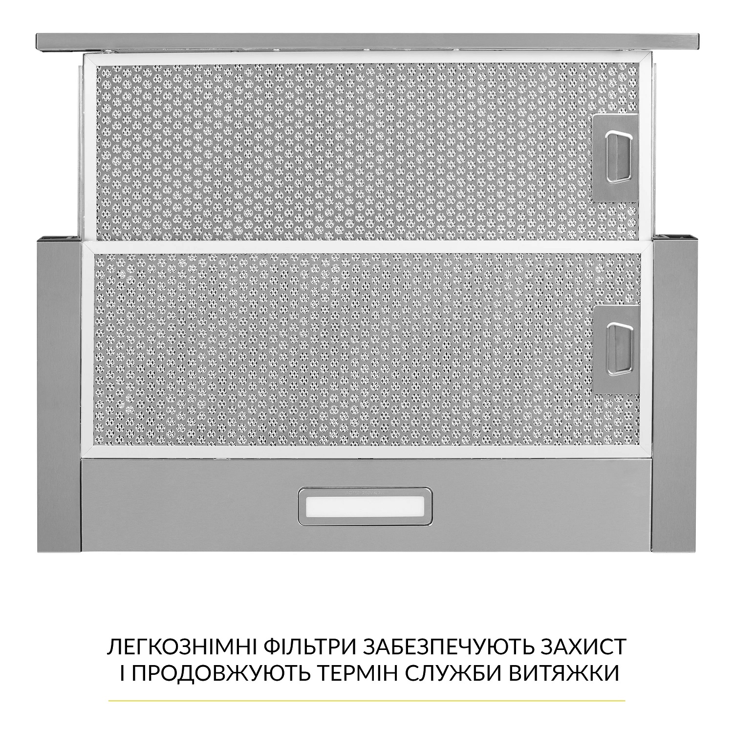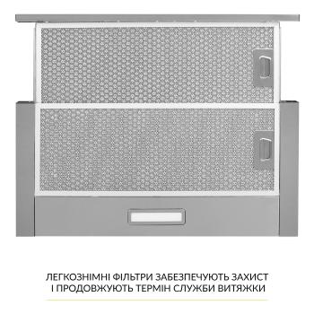 Жировий фільтр являє собою кілька шарів дрібно комірчастої сітки з алюмінію, тому він здатен затримувати найдрібніші частинки жиру. Це ефективно захищає всі внутрішні деталі пристрою від засмічення. Нержавіюча перфорація забезпечує кращу фільтрацію повітря та легкість в очищенні фільтру.