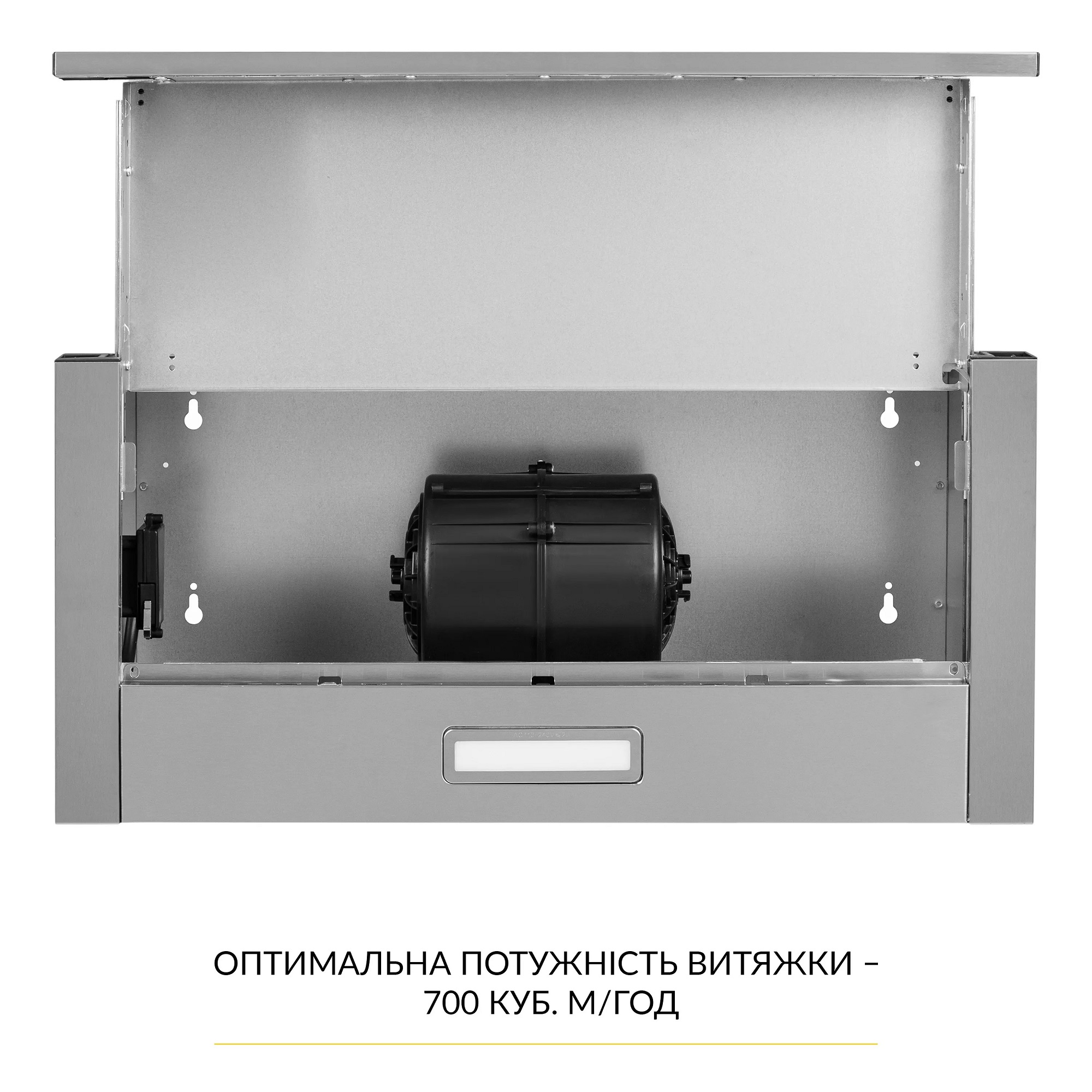Телескопічна витяжка WEILOR WT 63 SS ефективно впорається з покладеним на неї завданням. У витяжці встановлений двигун оптимальною потужністю 65 Вт, який забезпечує продуктивність до 700 м3/год. Цього достатньо для якісної вентиляції повітря на кухні невеликої площі.
