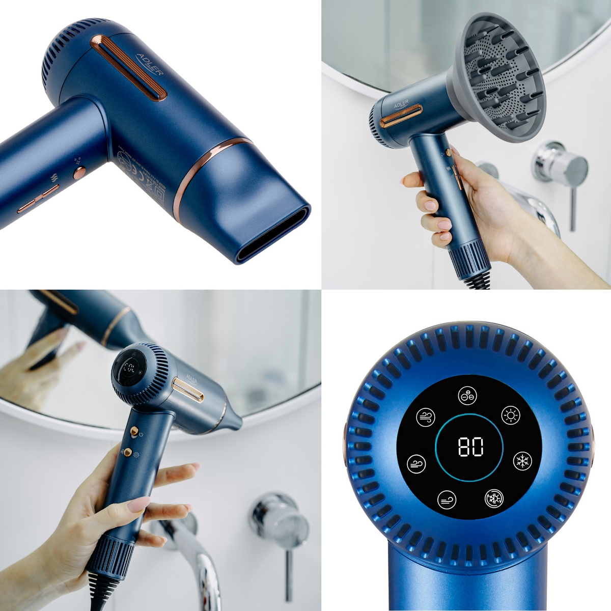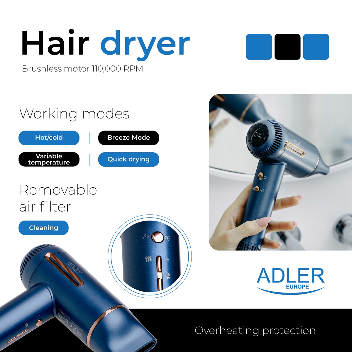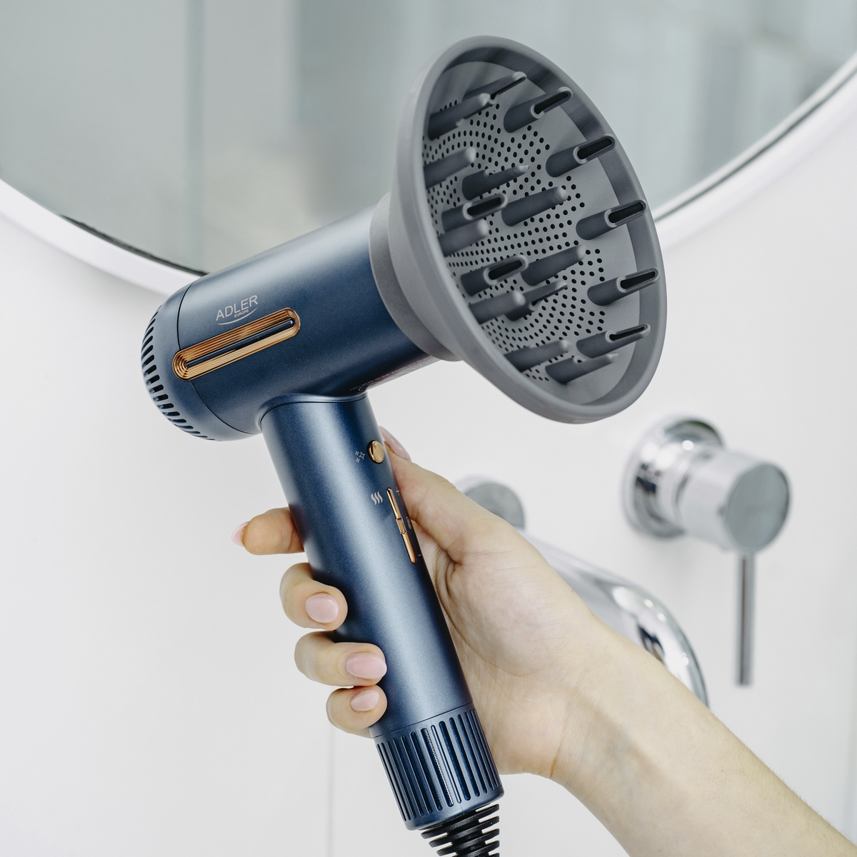 Фен пропонує 3 рівні потужності повітряного потоку і 6 налаштувань температури, що дозволяє адаптувати його до індивідуальних потреб. Крім того, три режими роботи (змінна температура, бриз, швидке сушіння) забезпечують універсальне застосування пристрою. Фен для волосся Adler AD 2271 виділяється на ринку завдяки своїй надзвичайно високій швидкості потоку повітря, що досягає 18 м/с.
