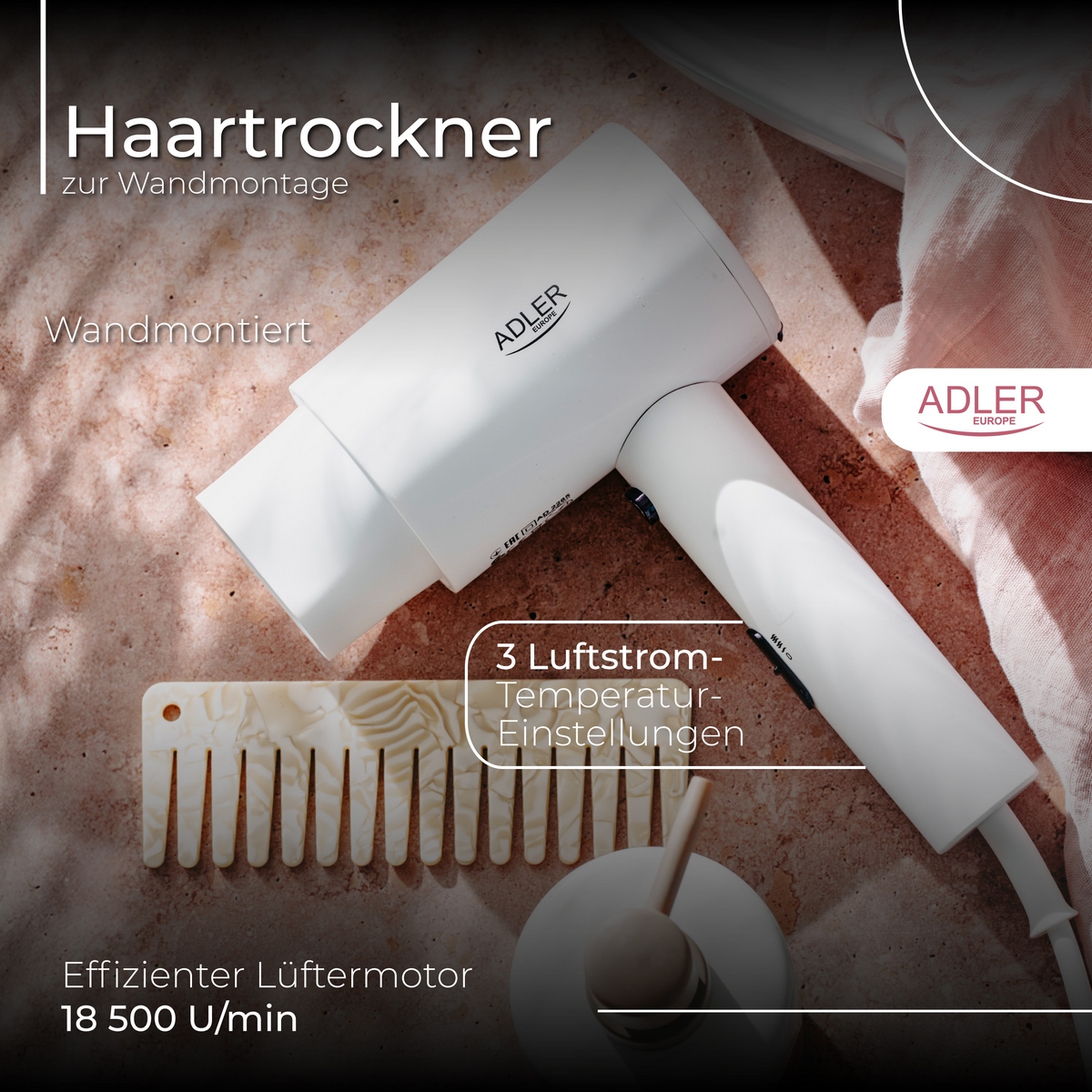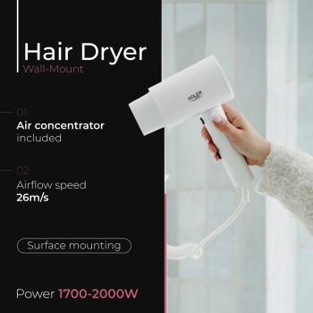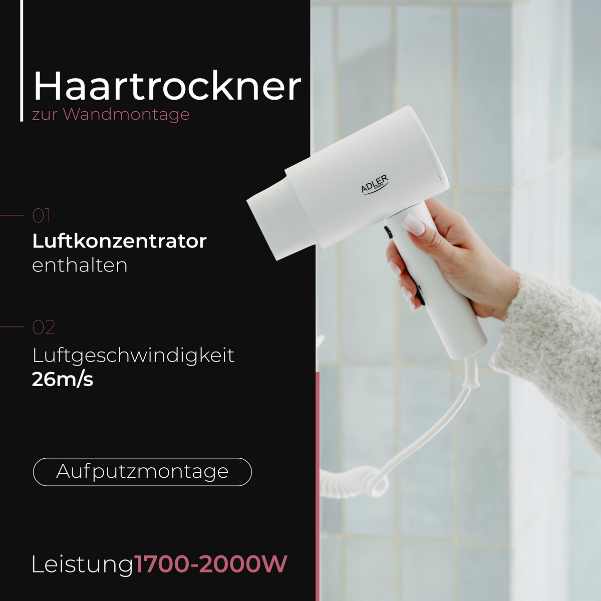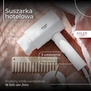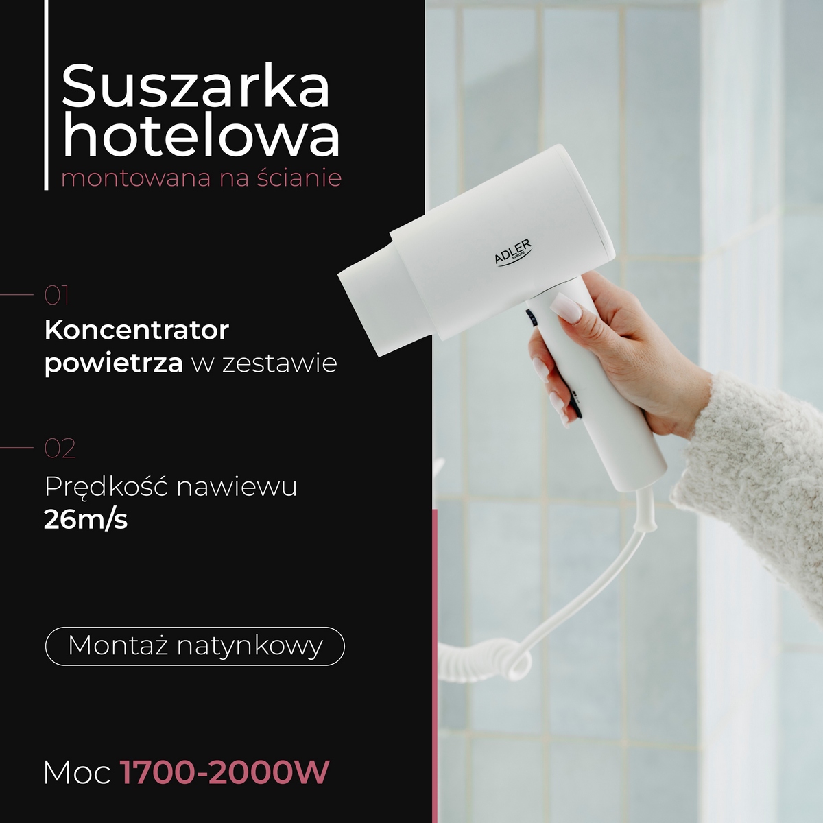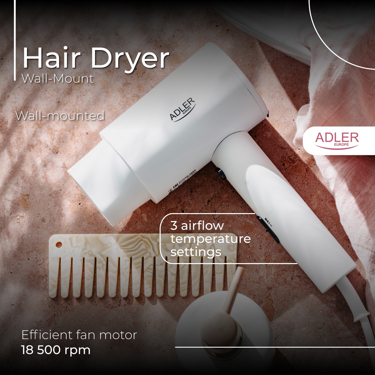 Забезпечте професійне та зручне сушіння волосся у ванних кімнатах готелів та громадських закладах завдяки фену для волосся Adler AD 2285 White. Фен готельний Adler AD 2285 White призначений для настінного монтажу, поєднує в собі безпеку, ефективність та сучасний стиль, що робить його ідеальним рішенням для готелів, тренажерних залів та спа-салонів.