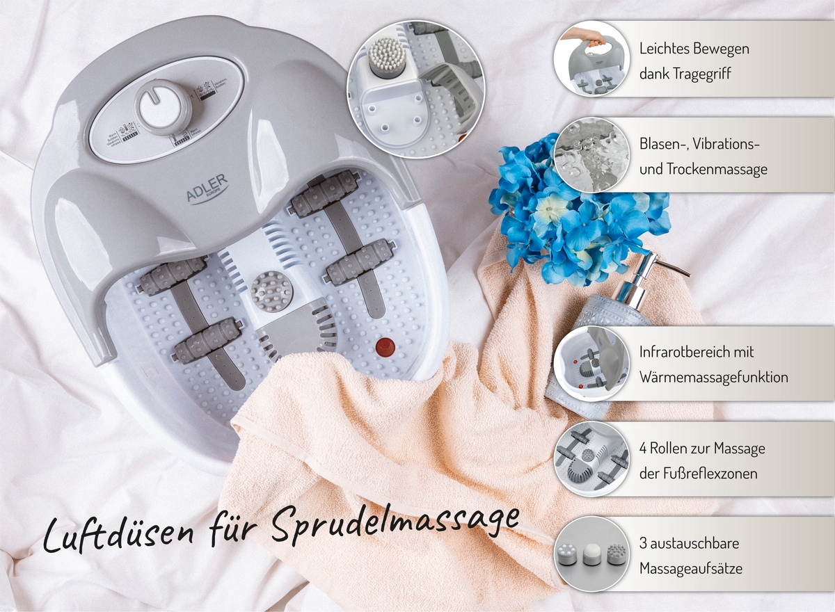Масаж ніг — ідеальний спосіб подбати про наше здоров'я та самопочуття. Адже протягом століть підкреслюється значення акупресури. Завдяки виступкам і роликам ми подбаємо про відповідний тиск на певні ділянки стопи. Інфрачервоні поля з функцією теплового масажу є прикладом сучасного підходу до масажу. При такому догляді за стопами важлива також відповідна температура, і завдяки функції підтримання тепла води ми не повинні турбуватися, що вода занадто швидко охолоне. Додатковий захист від розбризкування та індикатор рівня води роблять використання цього продукту безпечним, простим і дуже приємним. Достатньо налити теплу воду до вказаного рівня, підключити прилад до електромережі, помістити ноги і насолоджуватися приємними відчуттями!