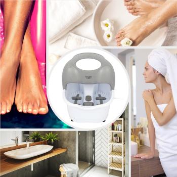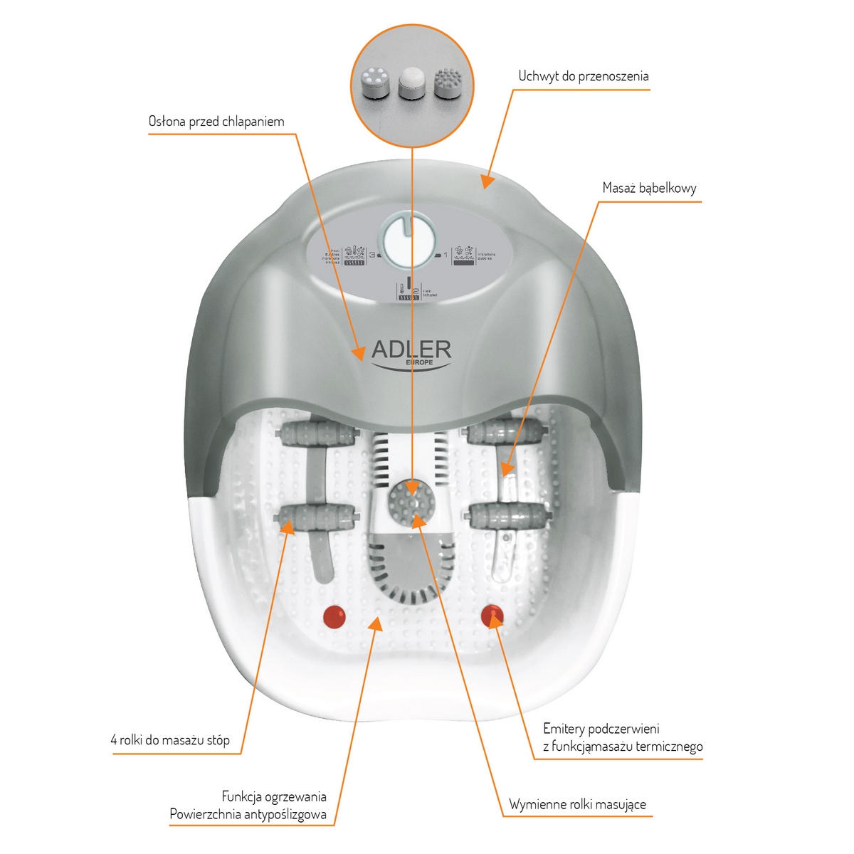 Пристрій для масажу ніг з ручкою для перенесення можна використовувати як вдома, так і в професійному спа-салоні. Варто пам'ятати, що він також корисний у лікувальних процедурах! Завдяки 4 роликам для масажу рефлекторних точок і 3 змінним насадкам для масажу, а також повітряним форсункам, які створюють бульбашки, ви можете вибрати: вібраційний і бульбашковий масаж у прохолодній воді, вібраційний і бульбашковий масаж у теплій воді або масаж інфрачервоними променями. Пристрій також оснащений підставкою для ніг з масажними виступом, що додатково допомагає нам розслабитися. До цього слід додати безпечні, нековзні ніжки, які, безсумнівно, стануть у нагоді при роботі з водою. Завдяки їм пристрій не ковзатиме по слизькій підлозі.